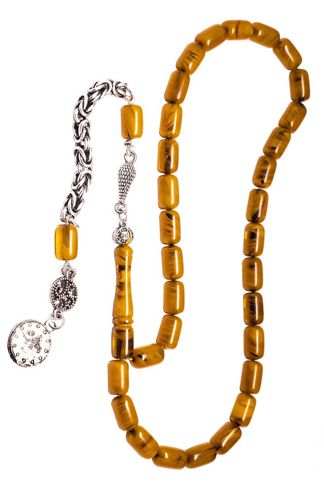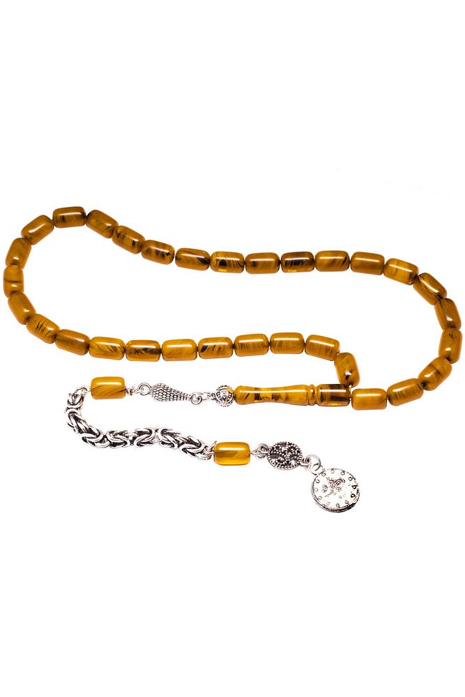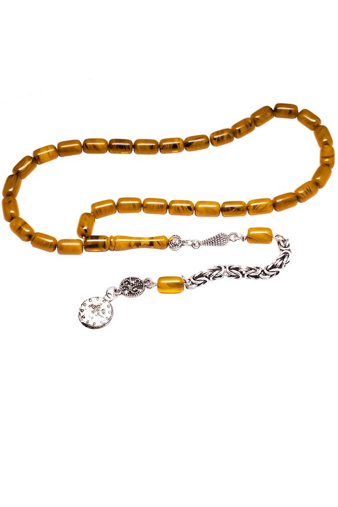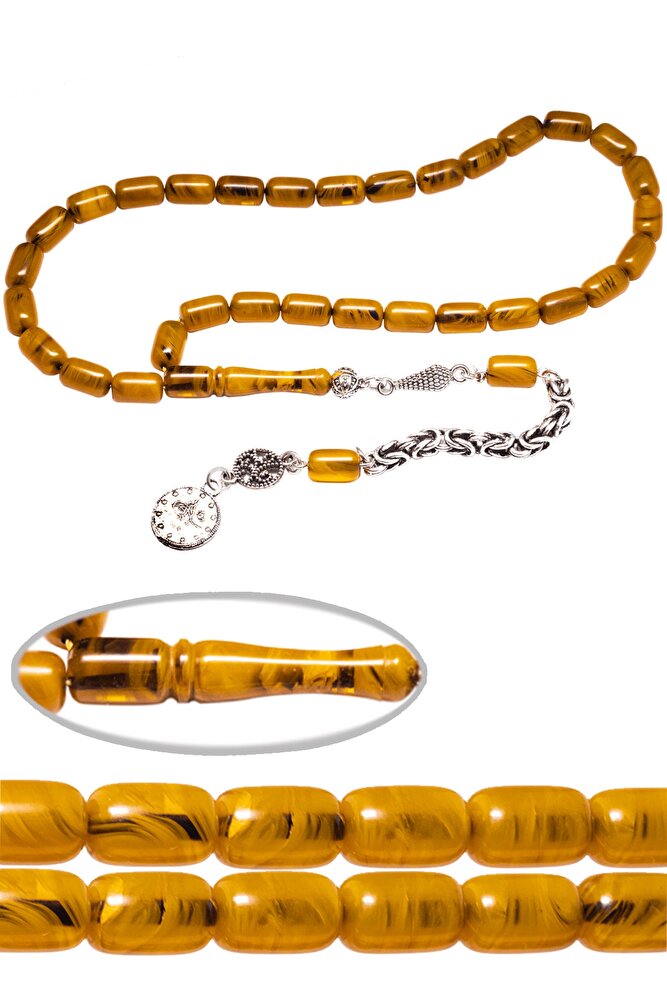 Ürün ya da Doğal Taş Açıklaması; ; (Baş Ağrısı Sinir ve Stres); ; Tesbih Atölyesi, Sıkma kehribar tesbih, tasarımları özel olarak usta ellerde tasarlanır. Tasarımlarımız el yapımı olup sınırlı adette üretilmektedir. Tasarımlarda kullanılan püsküller düşük ayar gümüşten imal edilir. Tasarımlarda kullanılan kehribar taneleri hareli özel kalıplardan yapılır. Yapay reçine ile üretilmektedir. Ürünlerimiz renk almakta ve koku vermektedirler. ; ; Bu tasarımda; Sarı renkli yoğun hareli özel 1.kalite çubuk sıkma kehribar reçine kullanılmıştır. Her kehribar tanesi birbirinin aynısı olmadığı için küçükte olsa farklılıklar gösterebilir.; ; Üretildiği Malzeme; Sıkma Kehribar; Ana Renk; Sarı Renk; Ağırlık; 20-30 gr; Tane Şekli; 7x10.5 mm; Tane Ölçüsü; Kapsül Kesim; Toplam Uzunluk; 20-30 cm; İmame ve Püskül Maddesi; Düşük Ayar Gümüş;