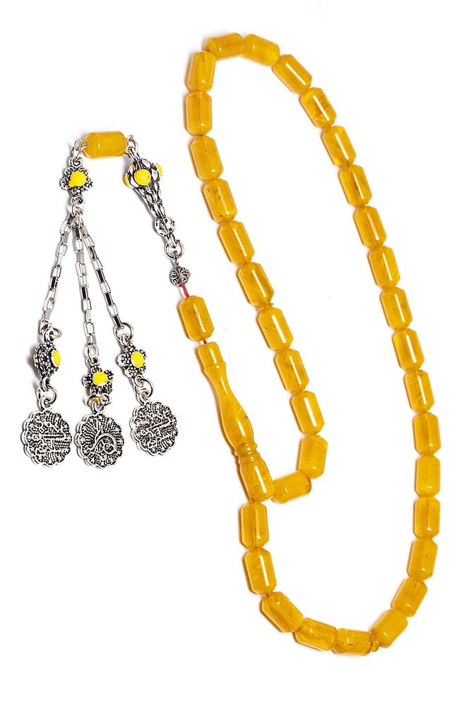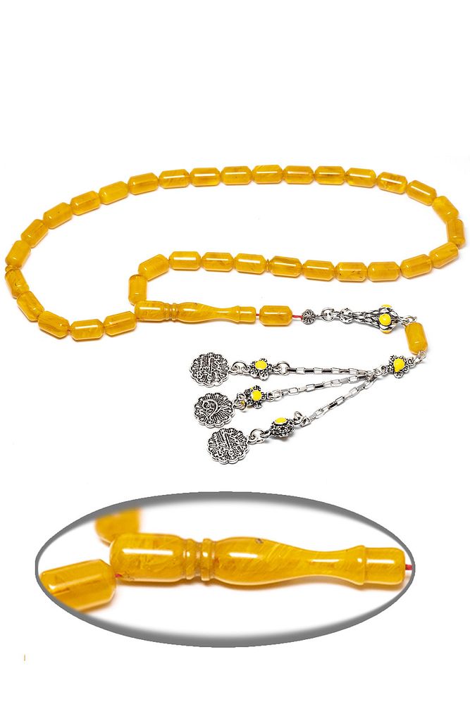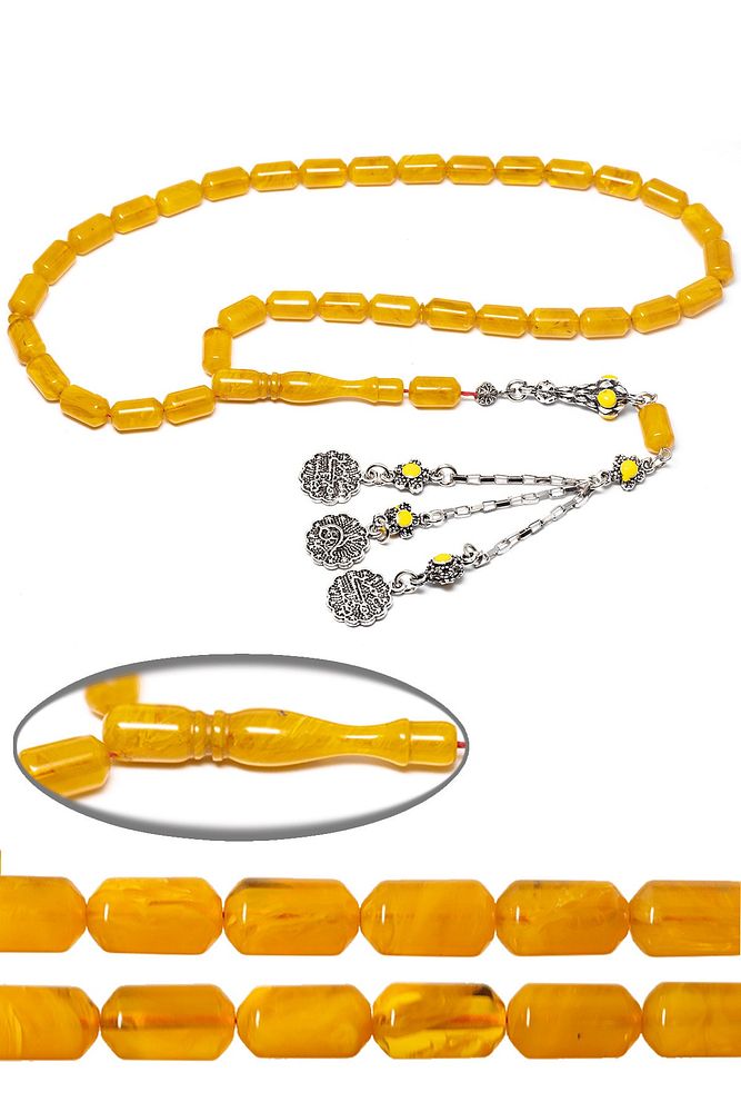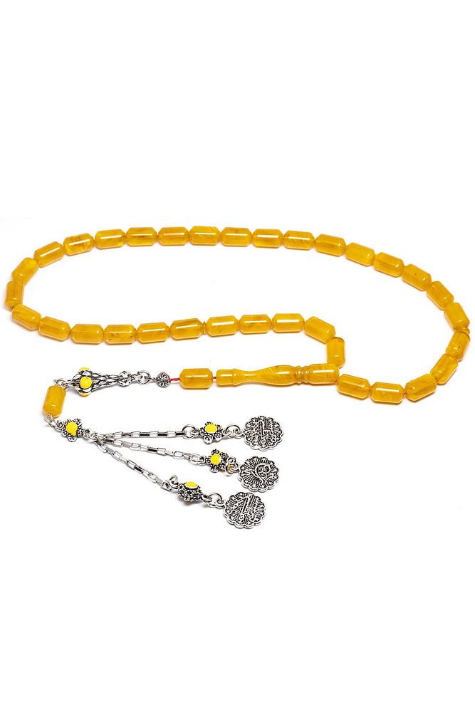 Sertifikalı Sarı Renkli Hareli Halep Püskül Sıkma Kehribar Tesbih