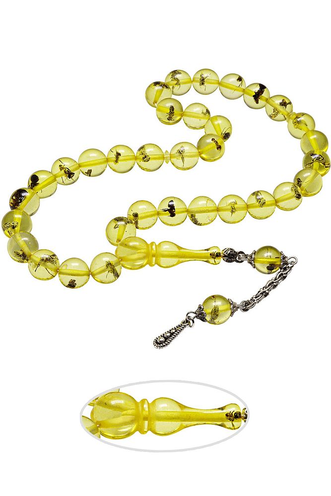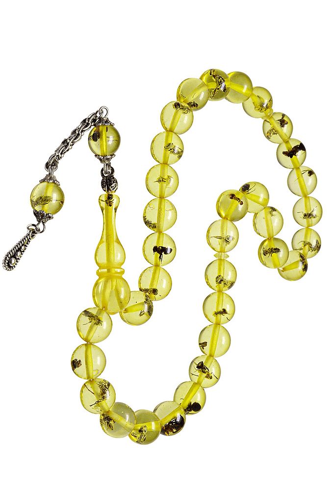 Sertifikalı Sarı Renkli Küre Kesim Karınca Fosilli Toz Kehribar Tesbih