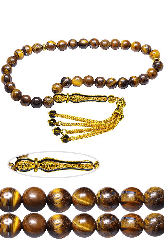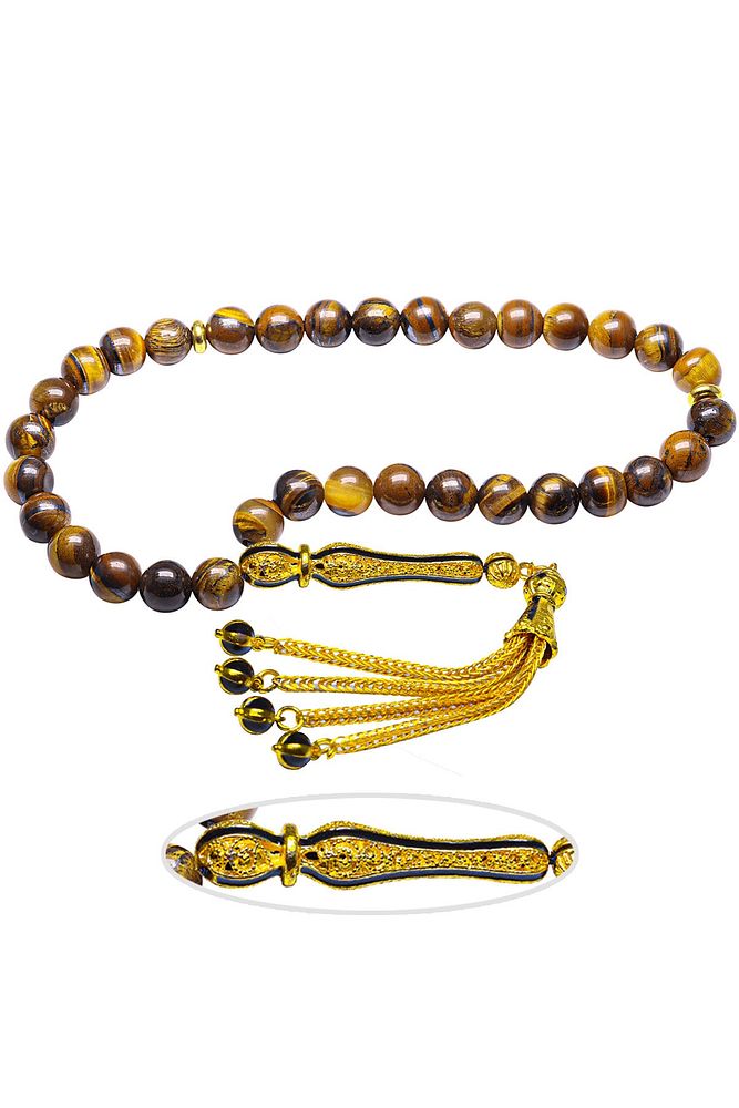 Sertifikalı Sarı Siyah Mineli Telkari Püsküllü Doğal Kaplan Gözü Taşı Tesbih