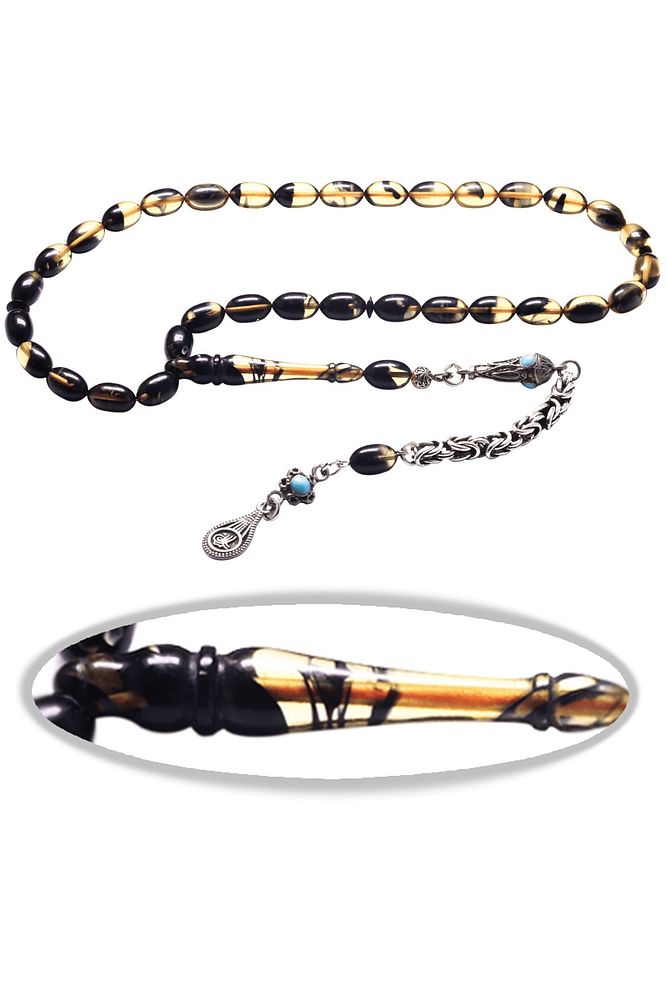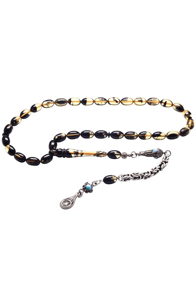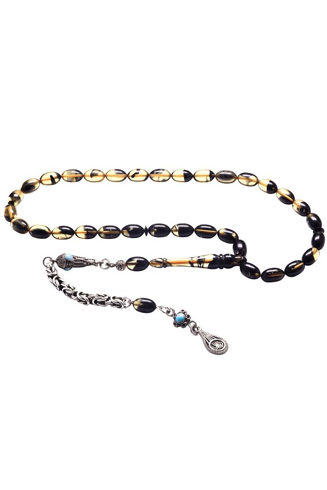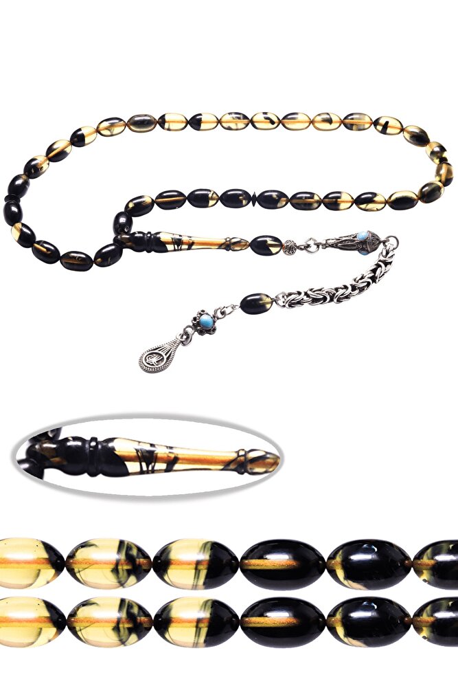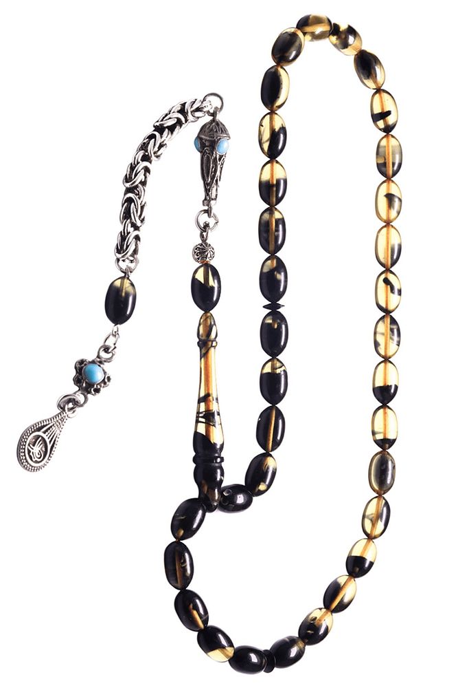 Sertifikalı Sarı Siyah Renk Beyzi Kesim Sıkma Kehribar Tesbih