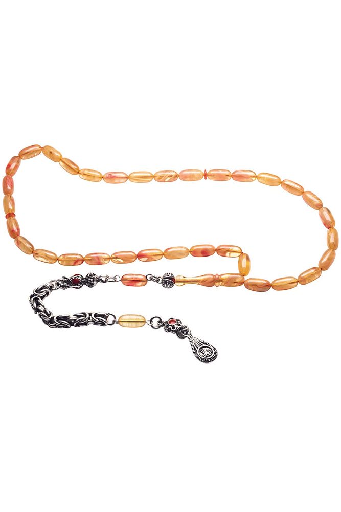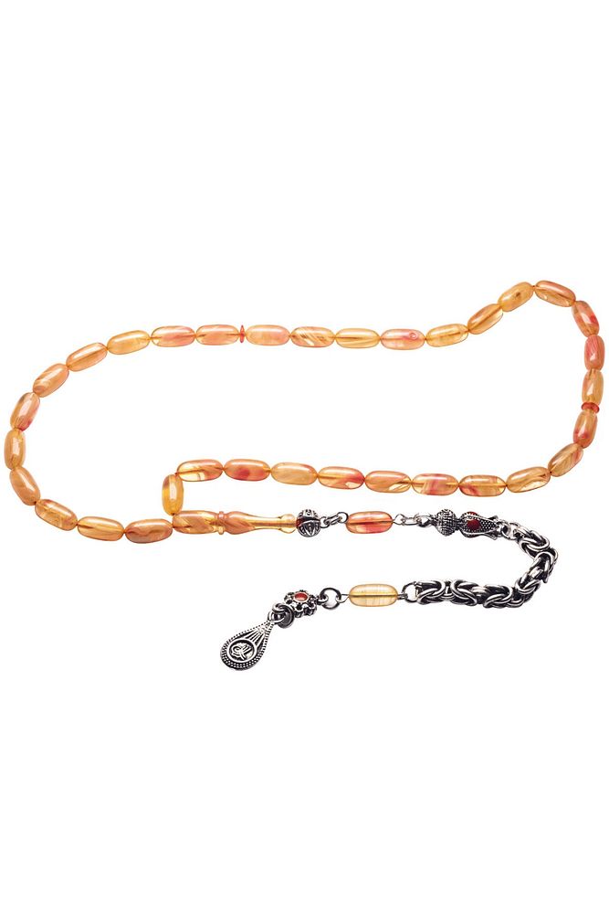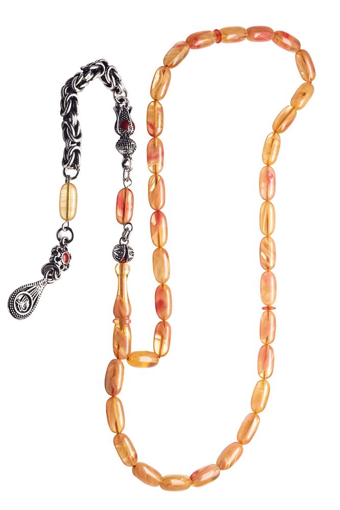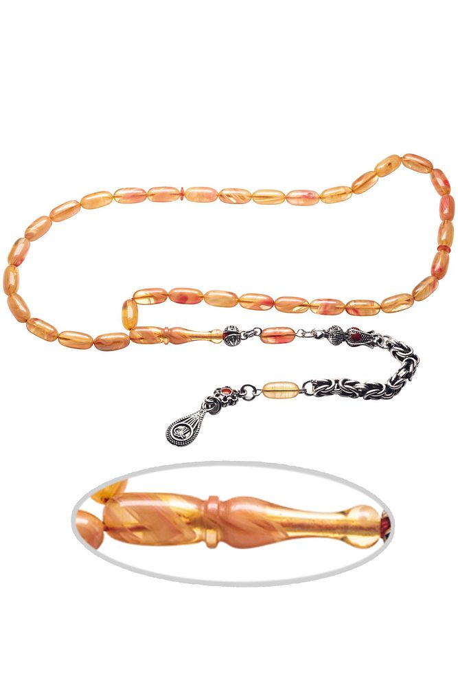 Ürün ya da Doğal Taş Açıklaması (Baş Ağrısı Sinir ve Stres) Tesbih Atölyesi, Sıkma kehribar tesbih, tasarımları özel olarak usta ellerde tasarlanır. Tasarımlarımız el yapımı olup sınırlı adette üretilmektedir. Tasarımlarda kullanılan püsküller düşük ayar gümüşten imal edilir. Tasarımlarda kullanılan kehribar taneleri hareli özel kalıplardan yapılır. Yapay reçine ile üretilmektedir. Ürünlerimiz renk almakta ve koku vermektedirler. Bu tasarımda; Sarı ve vişne renkli özel hareli renk alan kaliteli sıkma kehribar reçine kullanılmıştır. Her kehribar tanesi birbirinin aynısı olmadığı için küçükte olsa farklılıklar gösterebilir. Üretildiği Malzeme; Sıkma Kehribar; Ana Renk; Sarı ve Vişne Renk; Ağırlık; 20-30 gr; Tane Şekli; 5.5x11 mm; Tane Ölçüsü; Kapsül Kesim; Toplam Uzunluk; 20-30 cm; İmame ve Püskül Maddesi; Düşük Ayar Gümüş;