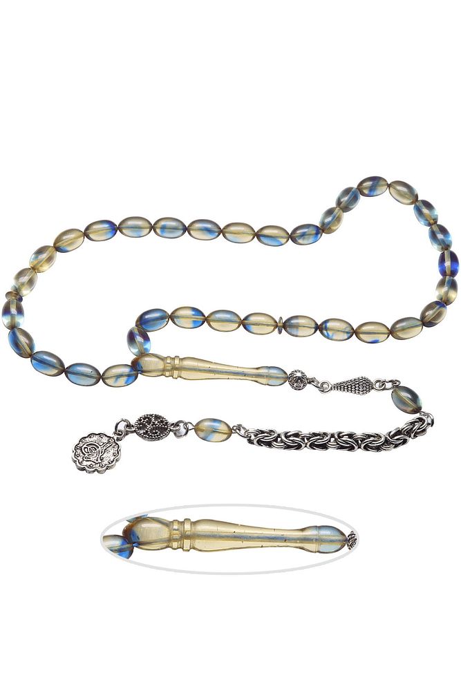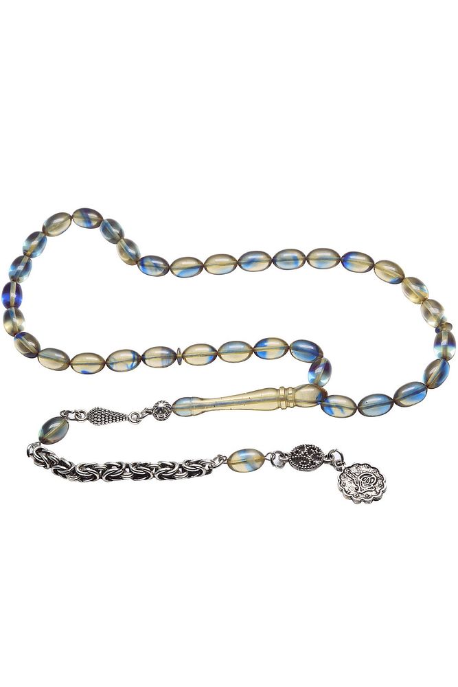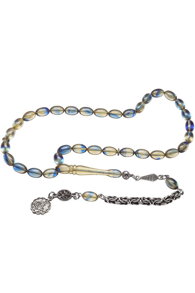 (Ağrı Kesici, Sinir Stres ve Bereket Taşı); ; Ateş kehribar tesbih modelleri, \'\'Tesbih Atölyesi\'\' Atölyelerinde ustalarımız tarafından kuru torna işciliği ile elde özen ile tane tane işlenmektedir. Ürünlerimiz el işciliği olduğu için sınırlı sayıda üretilmektedir. Tasarımlarımızda kullandığımız reçineler Dünya\'nın en kaliteli reçineleridir. Kısa bir süre içerisinde renk alır ve koku verir. Ürünleriniz orijinallik ve garanti belgesi ile gönderilir. Tasarımlarımıza üç kat cila atılmıştır. Muhteşem bir çekime sahip koleksiyonluk ve günlük çekim için ideal ürünlerdir.; ; Bu tasarımda; Şeffaf ve mavi renk hüzmesi özel 1.sınıf kalitede renk alan ve koku veren kaliteli ateş kehribar reçine kullanılmıştır. Her kehribar tanesi birbirinin aynısı olmadığı için küçükte olsa farklılıklar gösterebilir.; ; Üretildiği Malzeme; Ateş Kehribar; Ana Renk; Şeffaf ve Mavi Renk; Ağırlık; 20-30 gr; Tane Şekli; 7x11 mm; Tane Ölçüsü; Beyzi Kesim; Toplam Uzunluk; 20-30 cm; İmame ve Püskül Maddesi; Düşük Ayar Gümüş;