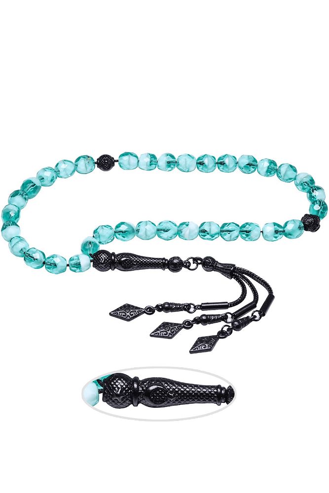 Ürün ya da Doğal Taş Açıklaması ; (Para - Sağlık - Pozitif Enerji Taşı); ; Kuvars tesbih modelleri, ''Tesbih Atölyesi'' Atölyelerinde ustalarımız tarafından kuru torna işciliği ile elde özen ile tane tane işlenmektedir. Ürünlerimiz el işciliği olduğu için sınırlı sayıda üretilmektedir. Tasarımlarımızda kullandığımız taşlar Dünya'nın en kaliteli doğal taşlarını kullanmaktayız. Tasarımlarımızda kullandığımız doğal taşların hiç biri birbirinin aynısı olmadığı için küçükte olsa farklılık gösterebilir. Doğal taşlar vücudunuza temas ettiği anda negatif enerjilerinizi alır ve pozitif enerjiler verir.; ; Bu tasarımda; Mavi renkli doğal kuvars taşı ve Siyah nikel alaşımlı imame ve püskül seti kullanılmıştır. Çift kaplama atıldığı için renk atmaz ve kararmaz bir yapıya sahiptir. Yedek ip ile gönderim sağlanır. ; ; Üretildiği Taş; Kuvars; Ana Renk; Doğal Renk; Ağırlık; 20-30 gr; Tane Şekli; 8x8 mm; Tane Ölçüsü; Küre Kesim; Toplam Uzunluk; 20-30 cm; İmame ve Püskül Maddesi; Düşük Ayar Gümüş;