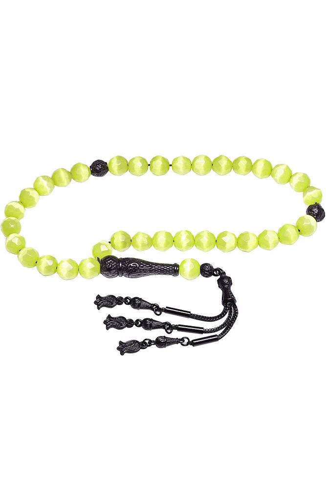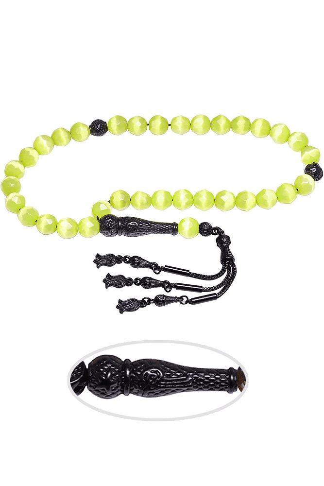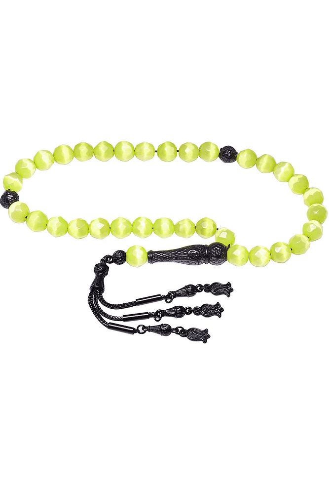 Sertifikalı Siyah Nikel Püsküllü Yeşil Doğal Kedi Taşı Gözü Tesbih
