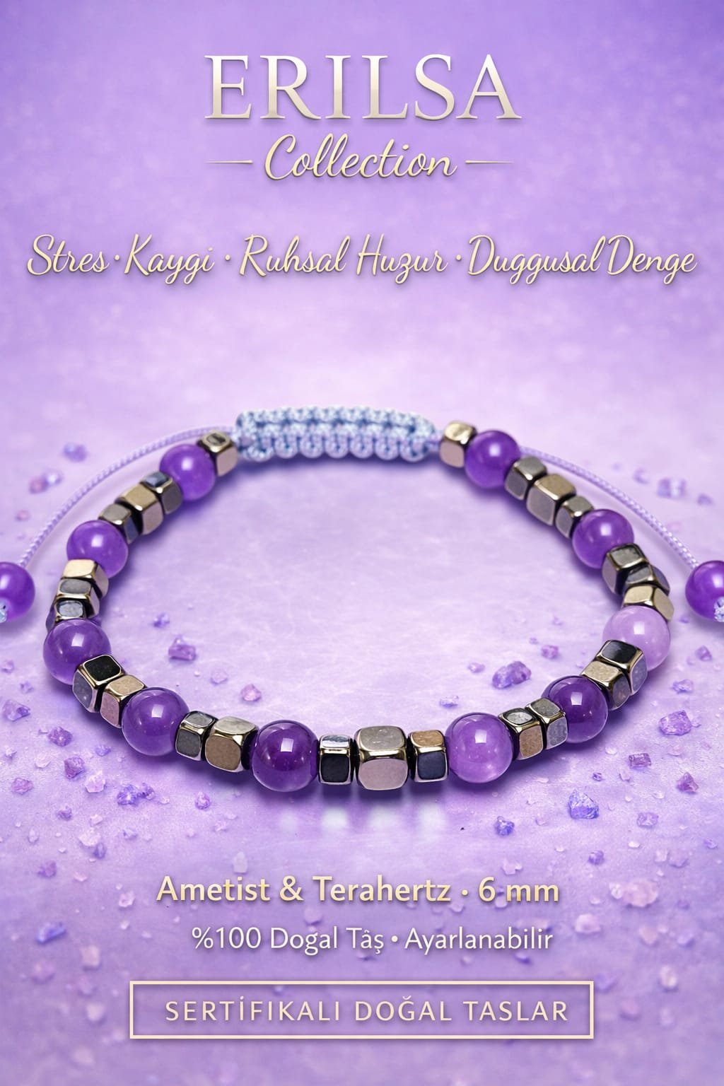 Bu ürün ERILSA Collection tarafından özenle hazırlanmış, tamamı sertifikalı ve doğal taşlardan oluşan özel bir bilekliktir. Ametist taşı ve Terahertz taşının birlikte kullanımı, zihinsel ve duygusal dengeyi desteklemeye yönelik olarak tercih edilmektedir.