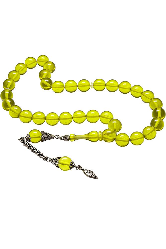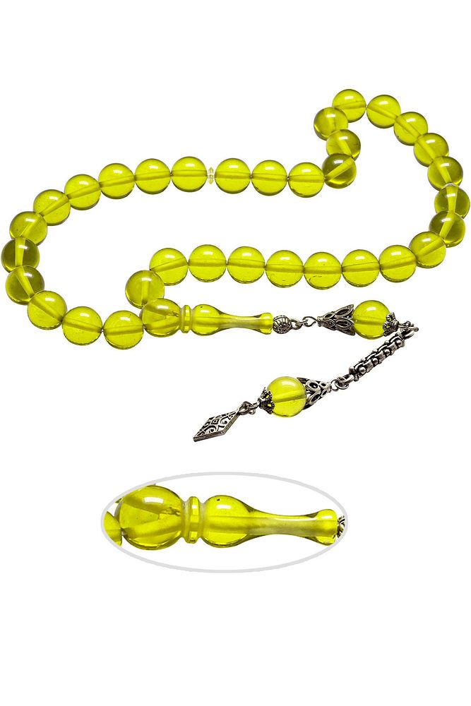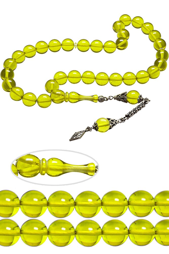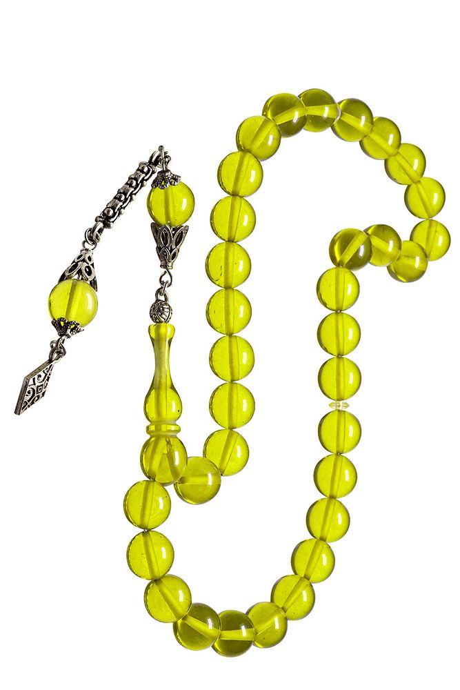 Ürün ya da Doğal Taş Açıklaması; ; (Para - Sağlık - Pozitif Enerji Taşı); ; Su Yeşili Renkli Toz Kehribar Tesbih modelleri, \'\'Tesbih Atölyesi\'\' Atölyelerinde ustalarımız tarafından kuru torna işciliği ile elde özen ile tane tane işlenmektedir. Ürünlerimiz el işciliği olduğu için sınırlı sayıda üretilmektedir. Tasarımlarımızda kullandığımız taşlar Dünya\'nın en kaliteli yapay reçinesi kullanmaktayız. Toz kehribar tesbih modellerimizin kalite olarak ateş ve sıkma kehribardan hiç bir farkı yoktur. Aradaki tek fark ateş ve sıkma kehribar tesbihin renk almasıdır.; ; Bu tasarımda; Su yeşili renkli toz kehribar kullanılmıştır. İmame ve Püskül yapımında; Düşük ayar gümüş kullanılmıştır. Çift kaplama rodaj atıldığı için renk atmaz ve kararmaz bir yapıya sahiptir. ; ; Üretildiği Malzeme; :; Toz Kehribar; Ana Renk; Su Yeşili Renk; Ağırlık; 20-30 gr; Tane Şekli; 10x10 mm; Tane Ölçüsü; Küre Kesim; Toplam Uzunluk; 20-30 cm; İmame ve Püskül Maddesi; Düşük Ayar Gümüş;