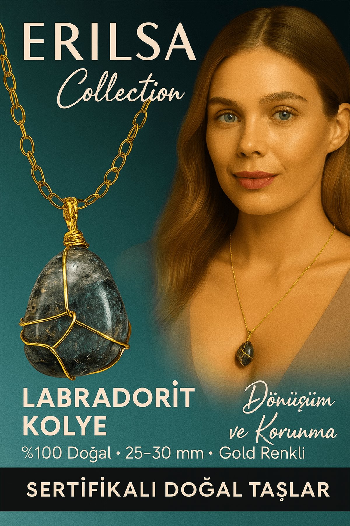 Sertifikalı Tel Sargılı Doğal Gold Labradorit Taşı Kolye – Altın Kaplama Sezgi ve Koruma Taşı