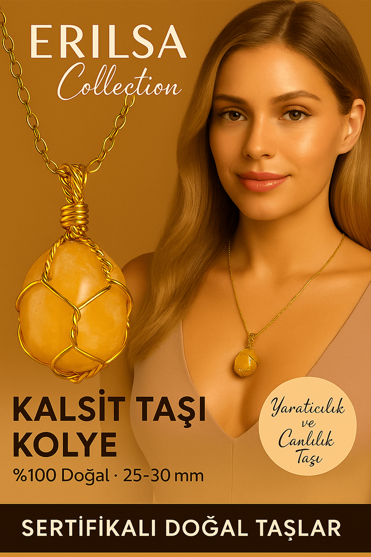Sertifikalı Tel Sargılı Doğal Sarı Kalsit Taşı Kolye – Altın Kaplama Canlılık ve Enerji Taşı