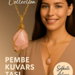 %100 doğal Pembe Kuvars Taşı kullanılarak özenle hazırlanmış bu zarif kolye, gold renkli tel sargı detayıyla doğallığı ve şıklığı bir araya getirir.