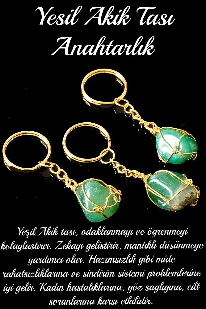 Sertifikalı Tel Sargılı Yeşil Akik Taşı Anahtarlık - Altın Kaplama