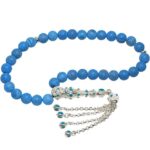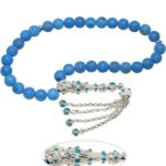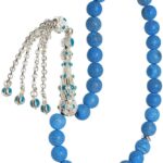 Ürün ya da Doğal Taş Açıklaması (Para, Bereket ve Pozitif Enerji Taşı) Akik tesbih modelleri, ”Tesbih Atölyesi” Atölyelerinde ustalarımız tarafından kuru torna işciliği ile elde özen ile tane tane işlenmektedir. Ürünlerimiz el işciliği olduğu için sınırlı sayıda üretilmektedir. Tasarımlarımızda kullandığımız taşlar Dünya’nın en kaliteli akik taşlarını kullanmaktayız. Tasarımlarımızda kullandığımız doğal taşların hiç biri birbirinin aynısı olmadığı için küçükte olsa farklılık gösterebilir. Vücudunuza temas ettiği anda negatif enerjilerinizi alır ve pozitif enerjiler verir. Yedek ipi gönderilir ve ürünlerimiz ”Tesbih Atölyesi” koruyucu ağaç kutusu ile gönderilmektedir. Bu tasarımın yapımında; Mavi damarlı doğal mavi akik taşı kullanılmıştır. İmame ve püskül tasarımında; Beyaz mavi mineli beyaz altın kaplama telkari imame ve püskül seti kullanılmıştır. Çift kaplama atıldığı için renk atmaz ve kararmaz bir yapıya sahiptir. Üretildiği Taş; Akik Taşı; Ana Renk; Doğal Renk; Ağırlık; 20-30 gr; Tane Şekli; 8×8 mm; Tane Ölçüsü; Küre Kesim; Toplam Uzunluk; 20-30 cm; İmame ve Püskül Maddesi; Düşük Ayar Gümüş;