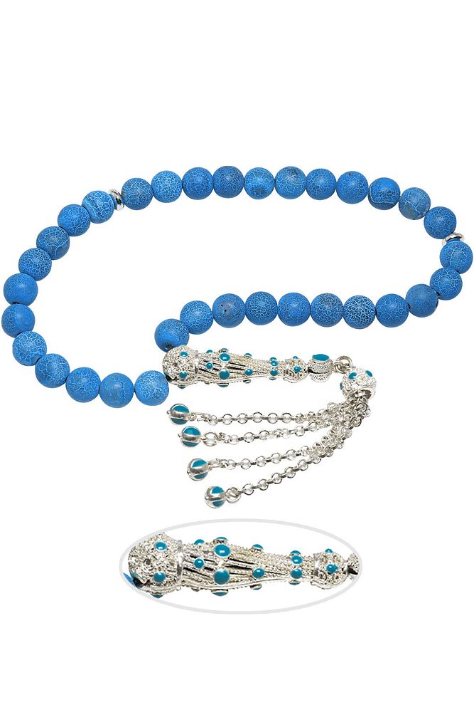 Sertifikalı Telkari Püskül Damarlı Mavi Doğal Akik Taşı Tesbih