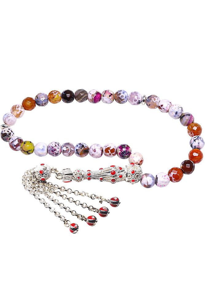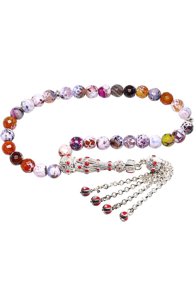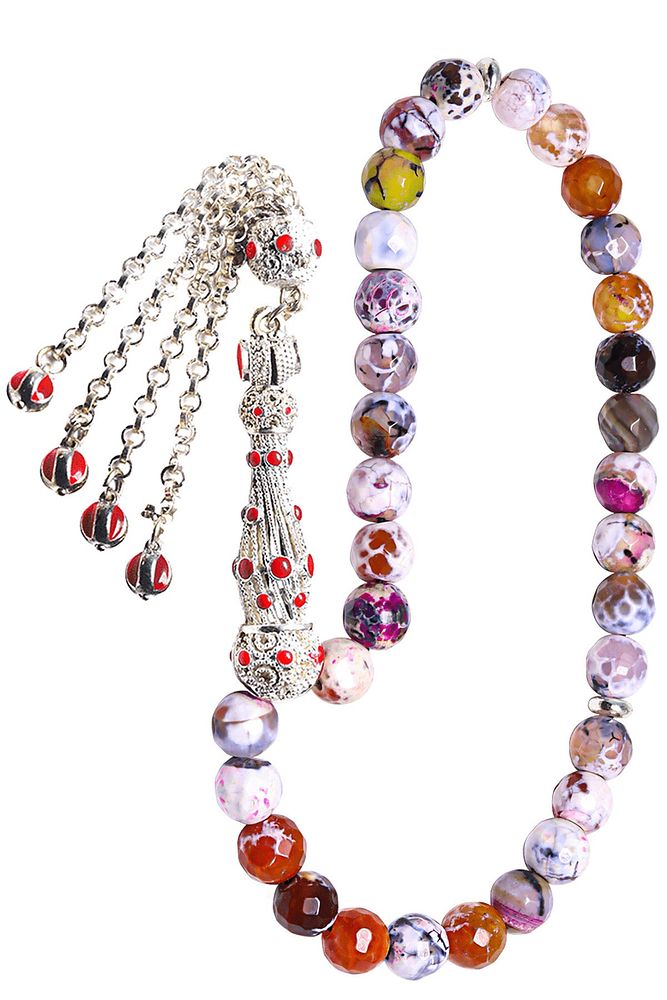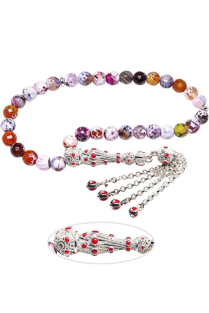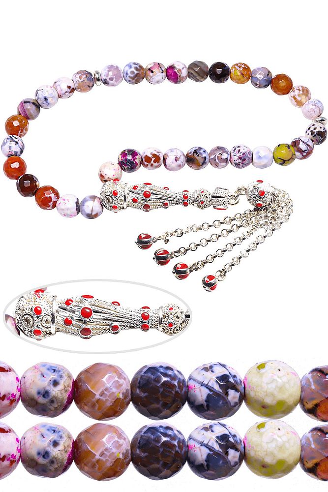 Ürün ya da Doğal Taş Açıklaması; ; (Para, Bereket ve Pozitif Enerji Taşı); ; Akik tesbih modelleri, ''Tesbih Atölyesi'' Atölyelerinde ustalarımız tarafından kuru torna işciliği ile elde özen ile tane tane işlenmektedir. Ürünlerimiz el işciliği olduğu için sınırlı sayıda üretilmektedir. Tasarımlarımızda kullandığımız taşlar Dünya'nın en kaliteli akik taşlarını kullanmaktayız. Tasarımlarımızda kullandığımız doğal taşların hiç biri birbirinin aynısı olmadığı için küçükte olsa farklılık gösterebilir. Vücudunuza temas ettiği anda negatif enerjilerinizi alır ve pozitif enerjiler verir. Yedek ipi gönderilir ve ürünlerimiz ''Tesbih Atölyesi'' koruyucu ağaç kutusu ile gönderilmektedir. ; ; Bu tasarımda; Mix karışık renkli özel akik taşı ve Beyaz kırmızı mineli beyaz altın kaplama imame ve püskül seti kullanılmıştır. Çift kaplama atılıdığı için renk atmaz ve kararmaz bir yapıya sahiptir. ; ; Üretildiği Taş; Akik Taşı; Ana Renk; Doğal Renk; Ağırlık; 20-30 gr; Tane Şekli; 8x8 mm; Tane Ölçüsü; Küre Kesim; Toplam Uzunluk; 20-30cm; İmame ve Püskül Maddesi; Düşük Ayar Gümüş;