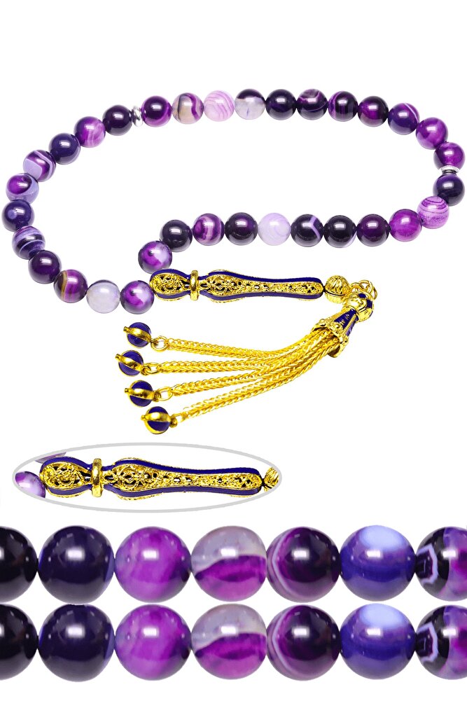 Ürün ya da Doğal Taş Açıklaması (Aşk ve Sevgi Taşı) Ametist tesbih modelleri, \'\'Tesbih Atölyesi\'\' Atölyelerinde ustalarımız tarafından kuru torna işciliği ile elde özen ile tane tane işlenmektedir. Ürünlerimiz el işciliği olduğu için sınırlı sayıda üretilmektedir. Tasarımlarımızda kullandığımız taşlar Dünya\'nın en kaliteli ametist taşlarını kullanmaktayız. Tasarımlarımızda kullandığımız doğal taşların hiç biri birbirinin aynısı olmadığı için küçükte olsa farklılık gösterebilir. Vücudunuza temas ettiği anda sizleri gevşetir sinirinizi ve stresinizi alır. Pozitif enerjiler verir. Yedek ipi gönderilir ve ürünlerimiz \'\'Tesbih Atölyesi\'\' koruyucu ağaç kutusu ile gönderilmektedir. Bu tasarımın yapımında; Küre kesim doğal ametist taşı kullanılmıştır. İmame ve püskül tasarımında; Sarı mavi mineli altın kaplama telkari imame ve püskül seti kullanılmıştır. Çift kaplama atıldığı için renk atmaz ve kararmaz bir yapıya sahiptir. Üretildiği Taş; Ametist Taşı; Ana Renk; Doğal Renk; Ağırlık; 20-30 gr; Tane Şekli; 8x8 mm; Tane Ölçüsü; Küre Kesim; Toplam Uzunluk; 20-30 cm; İmame ve Püskül Maddesi; Düşük Ayar Gümüş;