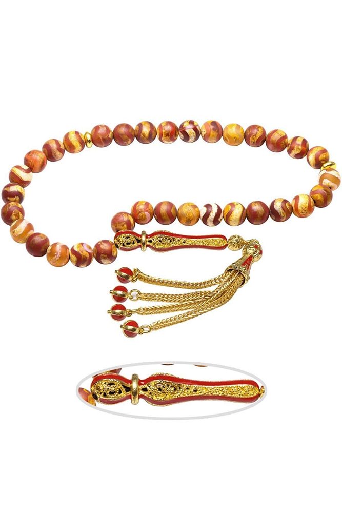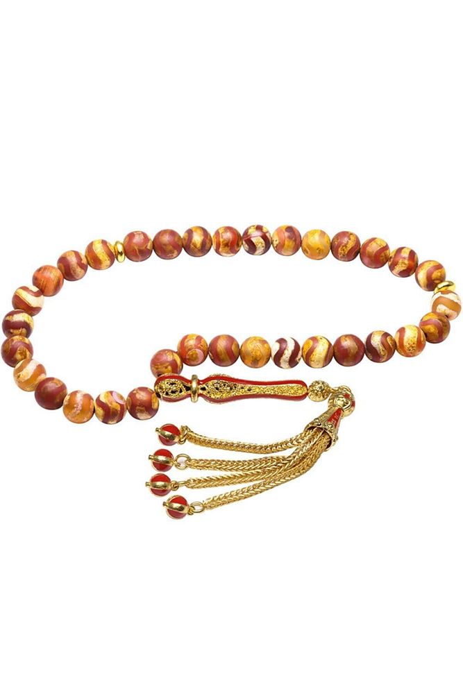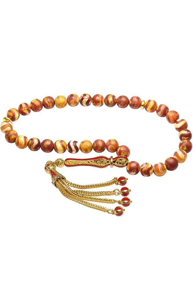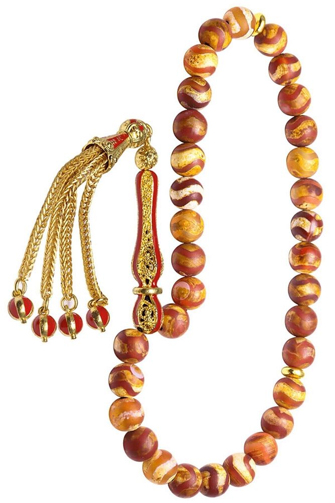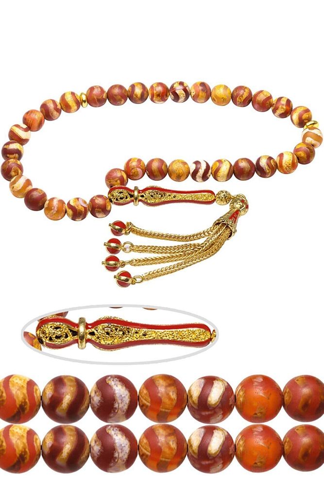 Ürün ya da Doğal Taş Açıklaması (Para, Bereket ve Pozitif Enerji Taşı) Akik tesbih modelleri, ''Tesbih Atölyesi'' Atölyelerinde ustalarımız tarafından kuru torna işciliği ile elde özen ile tane tane işlenmektedir. Ürünlerimiz el işciliği olduğu için sınırlı sayıda üretilmektedir. Tasarımlarımızda kullandığımız taşlar Dünya'nın en kaliteli akik taşlarını kullanmaktayız. Tasarımlarımızda kullandığımız doğal taşların hiç biri birbirinin aynısı olmadığı için küçükte olsa farklılık gösterebilir. Vücudunuza temas ettiği anda negatif enerjilerinizi alır ve pozitif enerjiler verir. Yedek ipi gönderilir ve ürünlerimiz ''Tesbih Atölyesi'' koruyucu ağaç kutusu ile gönderilmektedir. Bu tasarımın yapımında; Kahverengi renkli çizgili doğal tibet akik taşı kullanılmıştır. İmame ve püskül tasarımında; Sarı kırmızı mineli altın kaplama telkari imame ve püskül seti kullanılmıştır. Çift kaplama atıldığı için renk atmaz ve kararmaz bir yapıya sahiptir. Üretildiği Taş; Tibet Akik Taşı; Ana Renk; Doğal Renk; Ağırlık; 20-30 gr; Tane Şekli; 8x8 mm; Tane Ölçüsü; Küre Kesim; Toplam Uzunluk; 20-30 cm; İmame ve Püskül Maddesi; Düşük Ayar Gümüş.;