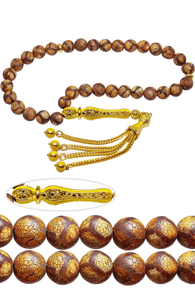 (Para, Bereket ve Pozitif Enerji Taşı) Akik tesbih modelleri, ''Tesbih Atölyesi'' Atölyelerinde ustalarımız tarafından kuru torna işciliği ile elde özen ile tane tane işlenmektedir. Ürünlerimiz el işciliği olduğu için sınırlı sayıda üretilmektedir. Tasarımlarımızda kullandığımız taşlar Dünya'nın en kaliteli akik taşlarını kullanmaktayız. Tasarımlarımızda kullandığımız doğal taşların hiç biri birbirinin aynısı olmadığı için küçükte olsa farklılık gösterebilir. Vücudunuza temas ettiği anda negatif enerjilerinizi alır ve pozitif enerjiler verir. Yedek ipi gönderilir ve ürünlerimiz ''Tesbih Atölyesi'' koruyucu ağaç kutusu ile gönderilmektedir. ; ; Bu tasarımda; Yoğun damarlı özel kahverengi çizgili tibet akik taşı ve altın kaplama sarı renkli sarı mineli telkari imame ve püskül seti kullanılmıştır. Çift kaplama atıldığı için renk atmaz ve kararmaz bir yapıya sahiptir. ; Üretildiği Taş; Akik Taşı; Ana Renk; Doğal Renk; Ağırlık; 20-30 gr; Tane Şekli; 8x8 mm; Tane Ölçüsü; Küre Kesim; Toplam Uzunluk; 20-30cm; İmame ve Püskül Maddesi; Düşük Ayar Gümüş;