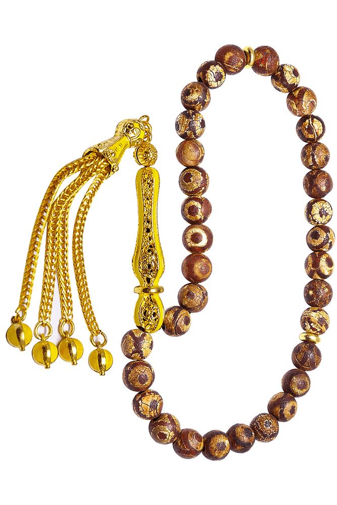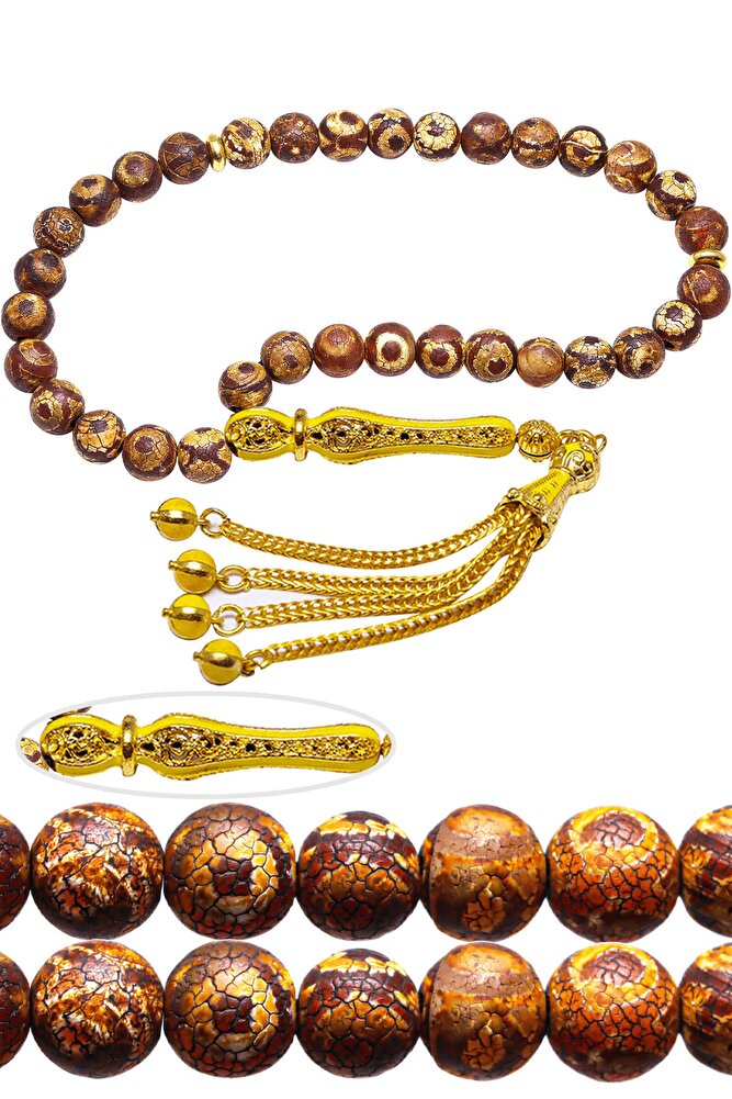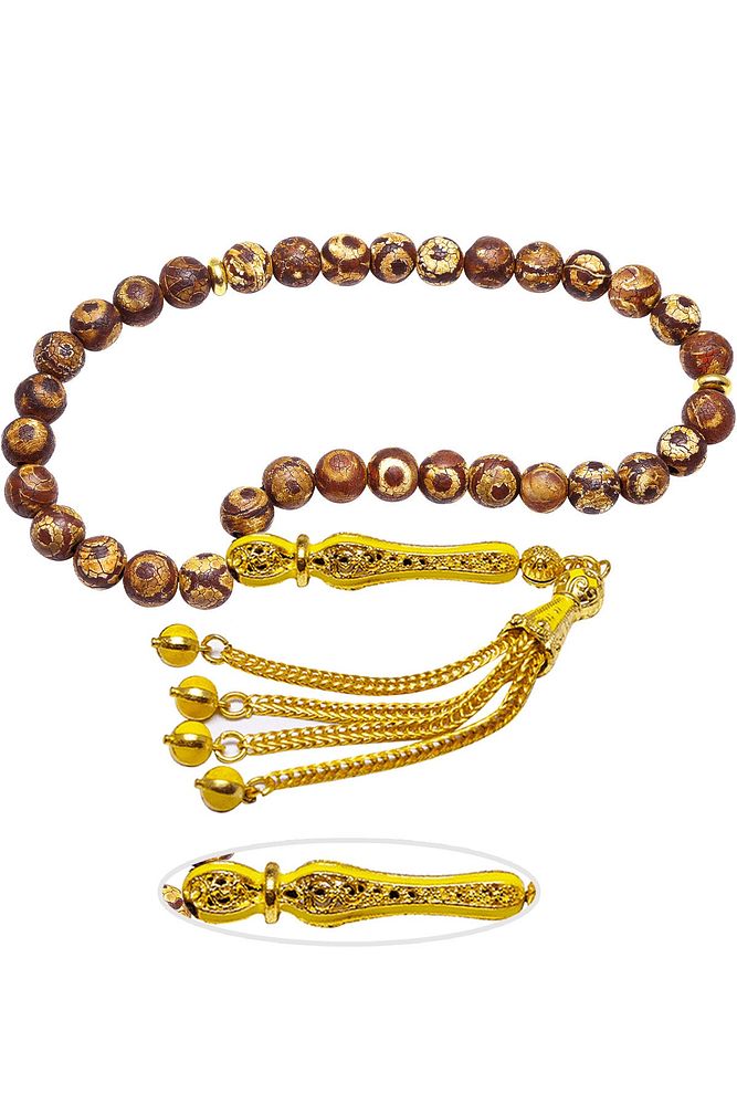 (Para, Bereket ve Pozitif Enerji Taşı); ; Akik tesbih modelleri, \'\'Tesbih Atölyesi\'\' Atölyelerinde ustalarımız tarafından kuru torna işciliği ile elde özen ile tane tane işlenmektedir. Ürünlerimiz el işciliği olduğu için sınırlı sayıda üretilmektedir. Tasarımlarımızda kullandığımız taşlar Dünya\'nın en kaliteli akik taşlarını kullanmaktayız. Tasarımlarımızda kullandığımız doğal taşların hiç biri birbirinin aynısı olmadığı için küçükte olsa farklılık gösterebilir. Vücudunuza temas ettiği anda negatif enerjilerinizi alır ve pozitif enerjiler verir. Yedek ipi gönderilir ve ürünlerimiz \'\'Tesbih Atölyesi\'\' koruyucu ağaç kutusu ile gönderilmektedir. ; ; Bu tasarımda; Kahverengi doğal tibet akik taşı ve sarı mineli altın kaplama telkari imame ve püskül seti kullanılmıştır. Çift kaplama atıldığı için renk atmaz ve kararmaz bir yapıya sahiptir. ; ; Üretildiği Taş; Akik Taşı; Ana Renk; Doğal Renk; Ağırlık; 20-30 gr; Tane Şekli; 8x8 mm; Tane Ölçüsü; Küre Kesim; Toplam Uzunluk; 20-30 cm; İmame ve Püskül Maddesi; Düşük Ayar Gümüş;