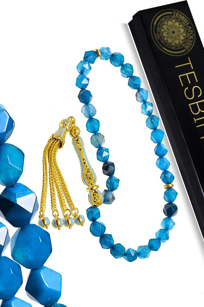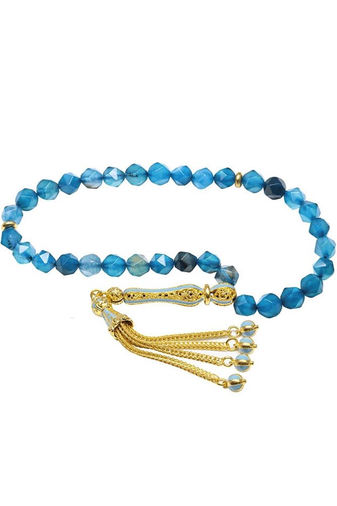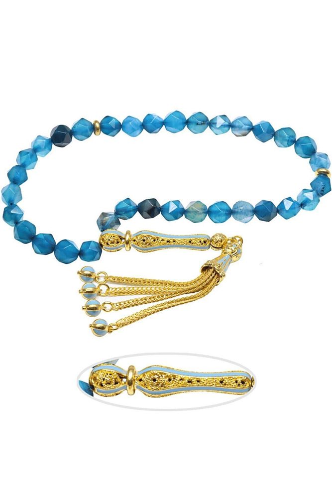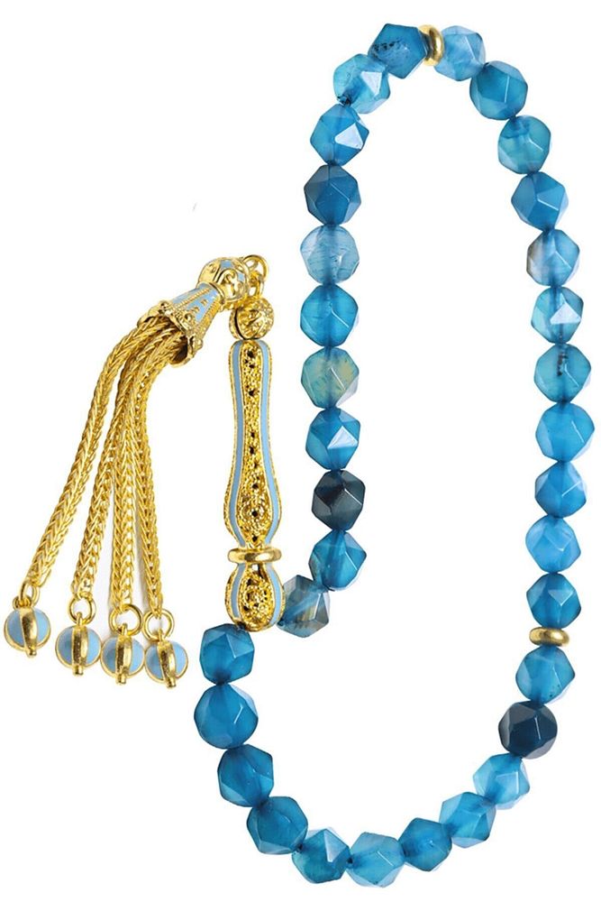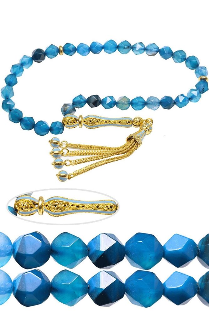 Sertifikalı Telkari Püskül Fasetli Mavi Doğal Akik Taşı Tesbih