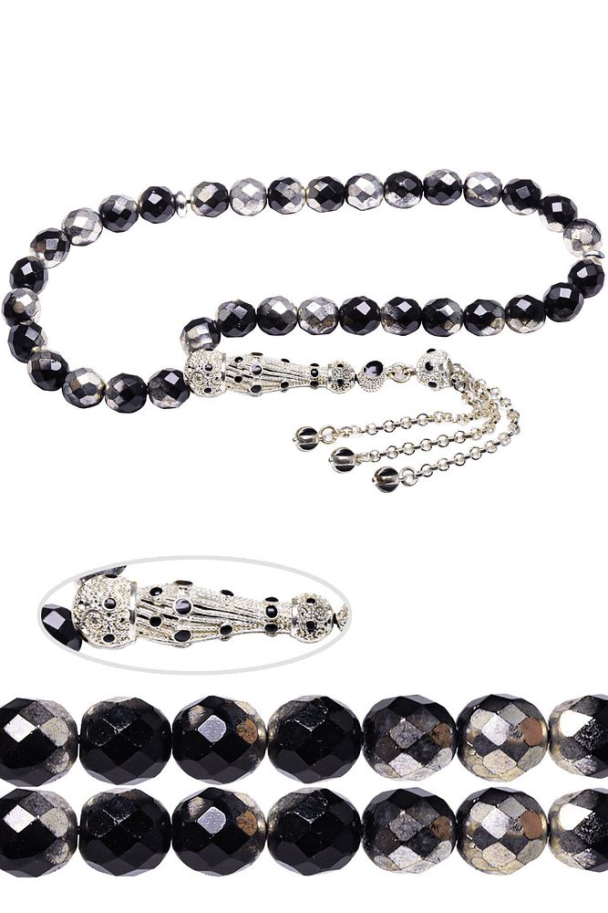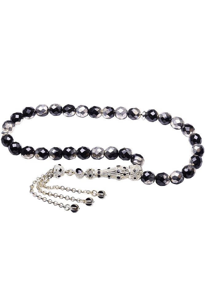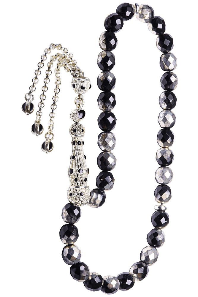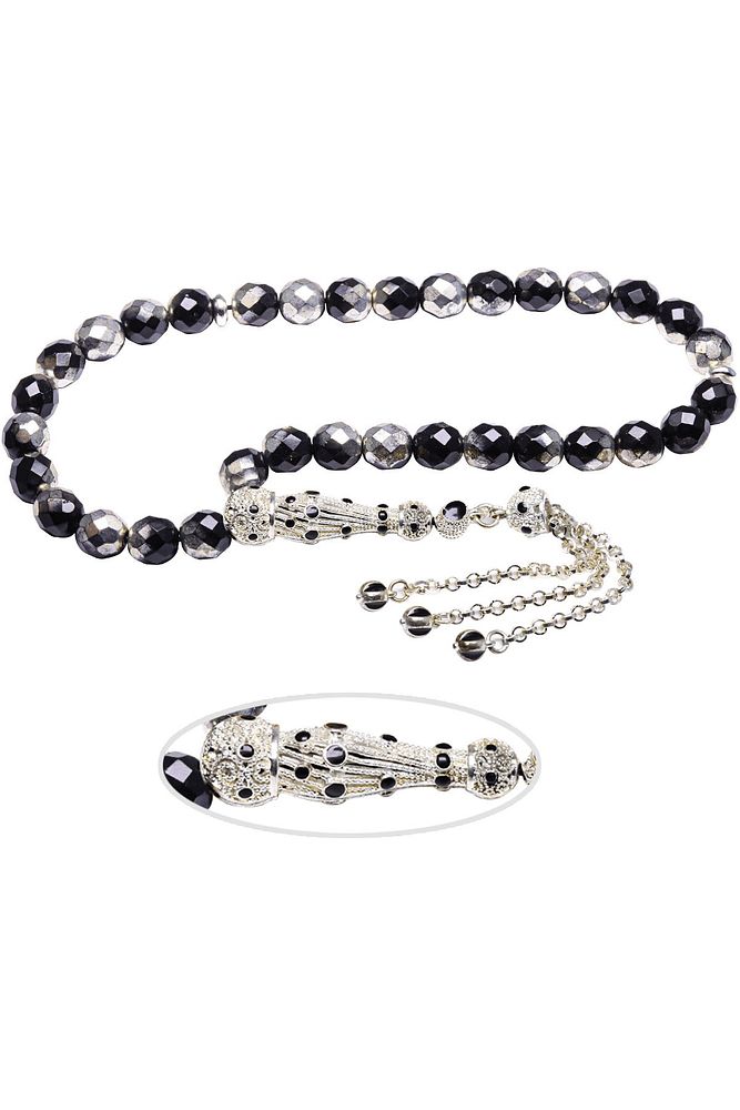 Sertifikalı Telkari Püskül Siyah Beyaz Doğal Hematit Taşı Tesbih