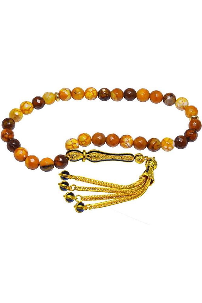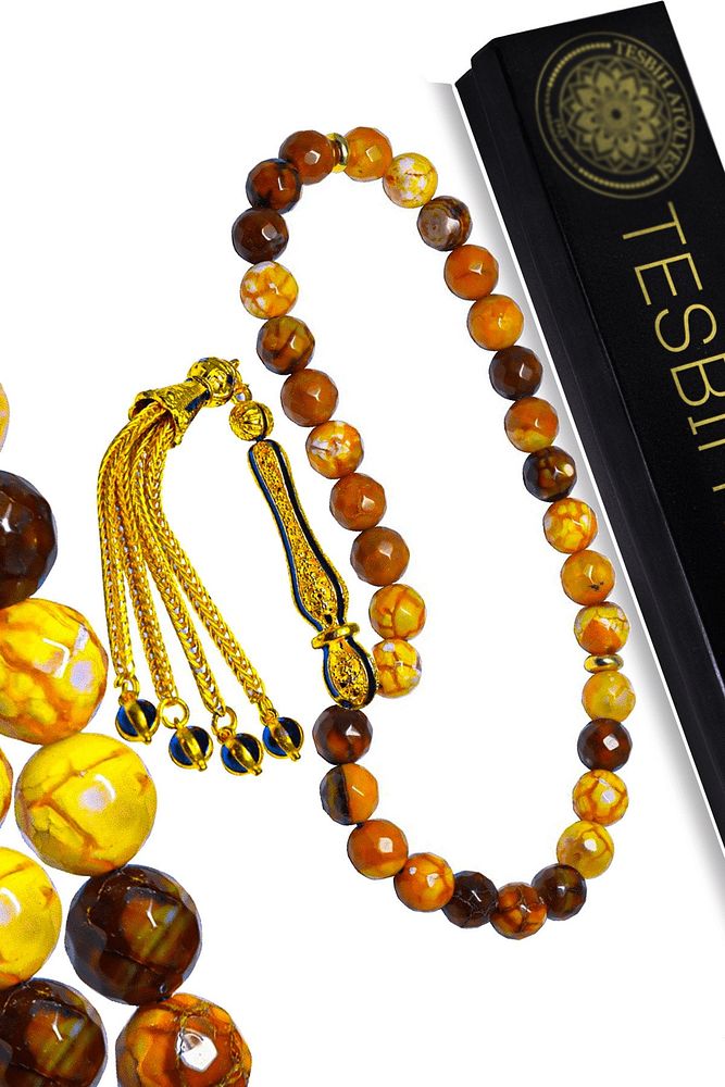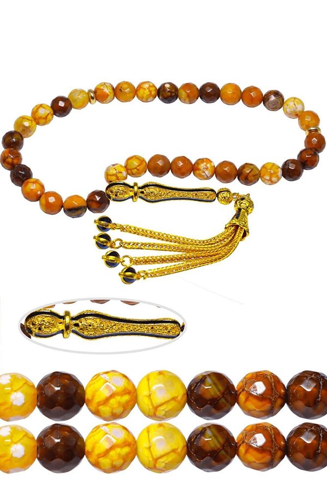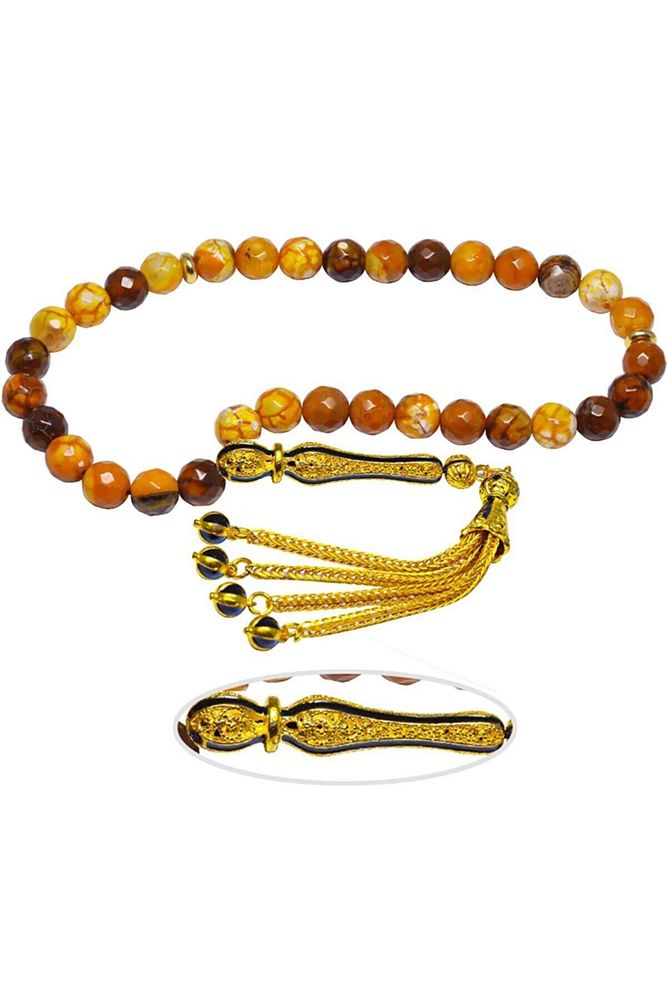 Ürün ya da Doğal Taş Açıklaması; ; (Para, Bereket ve Pozitif Enerji Taşı); ; Akik tesbih modelleri, ''Tesbih Atölyesi'' Atölyelerinde ustalarımız tarafından kuru torna işciliği ile elde özen ile tane tane işlenmektedir. Ürünlerimiz el işciliği olduğu için sınırlı sayıda üretilmektedir. Tasarımlarımızda kullandığımız taşlar Dünya'nın en kaliteli akik taşlarını kullanmaktayız. Tasarımlarımızda kullandığımız doğal taşların hiç biri birbirinin aynısı olmadığı için küçükte olsa farklılık gösterebilir. Vücudunuza temas ettiği anda negatif enerjilerinizi alır ve pozitif enerjiler verir. Yedek ipi gönderilir ve ürünlerimiz ''Tesbih Atölyesi'' koruyucu ağaç kutusu ile gönderilmektedir. ; ; Bu tasarımın yapımında; Turuncu damarlı akik taşı kullanılmıştır. İmame ve püskül tasarımında; Sarı siyah mineli altın kaplama telkari imame ve püskül seti kullanılmıştır. Çift kaplama atıldığı için renk atmaz ve kararmaz bir yapıya sahiptir. ; ; Üretildiği Taş; Akik Taşı; Ana Renk; Doğal Renk; Ağırlık; 20-30 gr; Tane Şekli; 8x8 mm; Tane Ölçüsü; Küre Kesim; Toplam Uzunluk; 20-30 cm; İmame ve Püskül Maddesi; Düşük Ayar Gümüş;