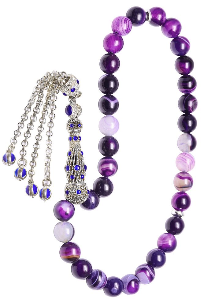 Ürün ya da Doğal Taş Açıklaması (Aşk ve Sevgi Taşı) Ametist tesbih modelleri, ''Tesbih Atölyesi'' Atölyelerinde ustalarımız tarafından kuru torna işciliği ile elde özen ile tane tane işlenmektedir. Ürünlerimiz el işciliği olduğu için sınırlı sayıda üretilmektedir. Tasarımlarımızda kullandığımız taşlar Dünya'nın en kaliteli ametist taşlarını kullanmaktayız. Tasarımlarımızda kullandığımız doğal taşların hiç biri birbirinin aynısı olmadığı için küçükte olsa farklılık gösterebilir. Vücudunuza temas ettiği anda sizleri gevşetir sinirinizi ve stresinizi alır. Pozitif enerjiler verir. Yedek ipi gönderilir ve ürünlerimiz ''Tesbih Atölyesi'' koruyucu ağaç kutusu ile gönderilmektedir. Bu tasarımın yapımında; Fasetli doğal küre kesim ametist taşı kullanılmıştır. İmame ve püskül tasarımında; Beyaz mavi mineli beyaz altın kaplama telkari imame ve püskül seti kullanılmıştır. Çift kaplama atıldığı için renk atmaz ve kararmaz bir yapıya sahiptir. Üretildiği Taş; Ametist Taşı; Ana Renk; Doğal Renk; Ağırlık; 20-30 gr; Tane Şekli; 8x8 mm; Tane Ölçüsü; Küre Kesim; Toplam Uzunluk; 20-30 cm; İmame ve Püskül Maddesi; Düşük Ayar Gümüş;