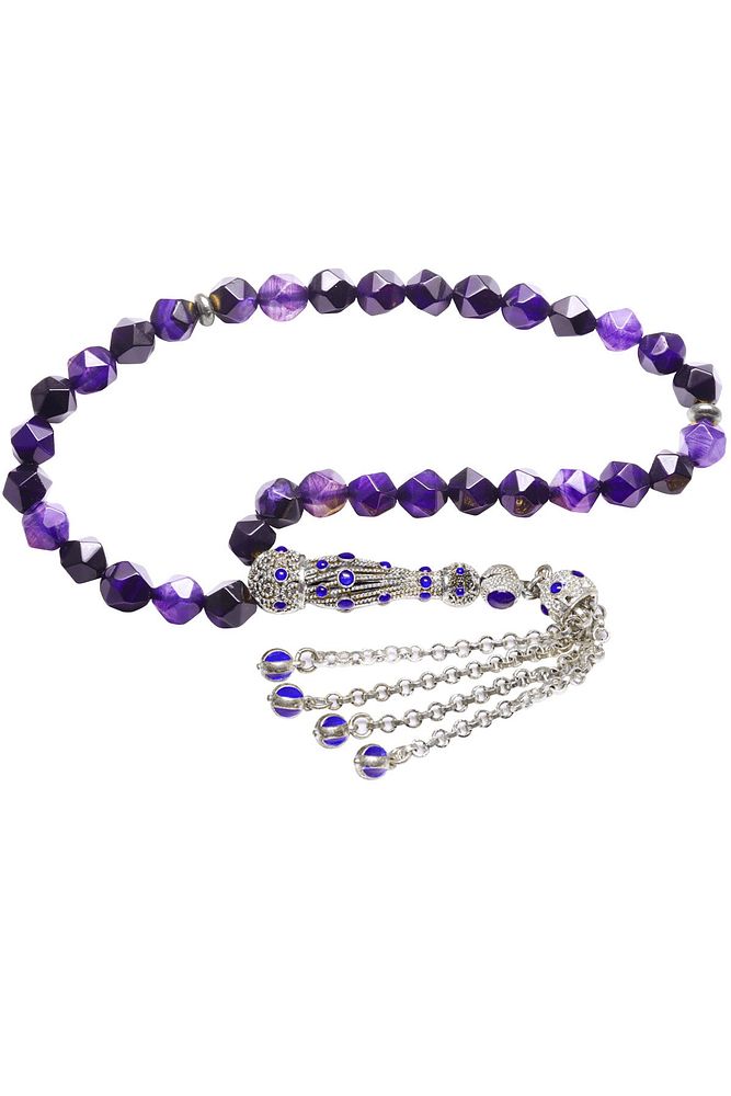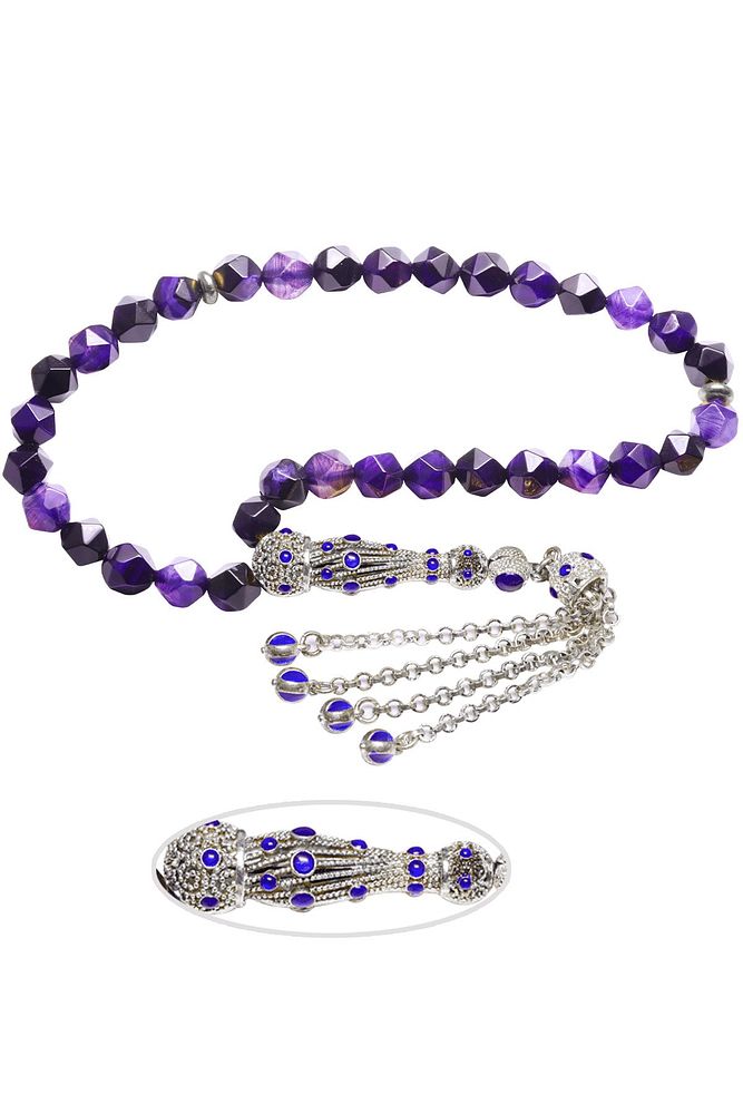 Ürün ya da Doğal Taş Açıklaması (Aşk ve Sevgi Taşı) Ametist tesbih modelleri, ''Tesbih Atölyesi'' Atölyelerinde ustalarımız tarafından kuru torna işciliği ile elde özen ile tane tane işlenmektedir. Ürünlerimiz el işciliği olduğu için sınırlı sayıda üretilmektedir. Tasarımlarımızda kullandığımız taşlar Dünya'nın en kaliteli ametist taşlarını kullanmaktayız. Tasarımlarımızda kullandığımız doğal taşların hiç biri birbirinin aynısı olmadığı için küçükte olsa farklılık gösterebilir. Vücudunuza temas ettiği anda sizleri gevşetir sinirinizi ve stresinizi alır. Pozitif enerjiler verir. Yedek ipi gönderilir ve ürünlerimiz ''Tesbih Atölyesi'' koruyucu ağaç kutusu ile gönderilmektedir. Bu tasarımın yapımında; Elmas kesim doğal ametist taşı kullanılmıştır. İmame ve püskül tasarımında; Beyaz mavi mineli altın kaplama telkari imame ve püskül seti kullanılmıştır. Çift kaplama atıldığı için renk atmaz ve kararmaz bir yapıya sahiptir. Üretildiği Taş; Ametist Taşı; Ana Renk; Doğal Renk; Ağırlık; 20-30 gr; Tane Şekli; 7x8 mm; Tane Ölçüsü; Elmas Kesim; Toplam Uzunluk; 20-30 cm; İmame ve Püskül Maddesi; Düşük Ayar Gümüş;