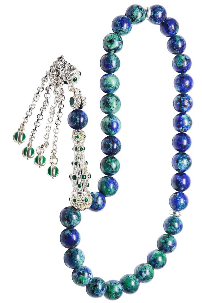 (Pozitif Enerji, Bereket ve Nazar Taşı); ; Jade yeşim taşı tesbih modelleri, ''Tesbih Atölyesi'' Atölyelerinde usta ellerde üretilmektedir. Tasarımlarımızda Dünya'nın en kaliteli doğal taşlarını kullanmaktayız. Ürünlerimiz el işciliği olduğu için sınırlı sayıda üretilmektedir. Tasarımlarımızda kullandığımız doğal taşların hiç biri birbirinin aynısı olmadığı için küçükte olsa farklılık gösterebilir. ; ; Bu tasarımda; Mavi ve yeşil renkli doğal jade yeşim taşı kullanılmıştır. Beyaz turkuaz mineli 24 ayar altın kaplama imame ve püskül seti kullanılmıştır. Çift kaplama atıldığı için renk atmaz ve kararmaz bir yapıya sahiptir. Yedek ip ile gönderim sağlanır. ; Üretildiği Taş; Yeşim Taşı; Ana Renk; Doğal Renk; Ağırlık; 20-30 gr; Tane Şekli; 8x8 mm; Tane Ölçüsü; Küre Kesim; Toplam Uzunluk; 20-30 cm; İmame ve Püskül Maddesi; Düşük Ayar Gümüş;