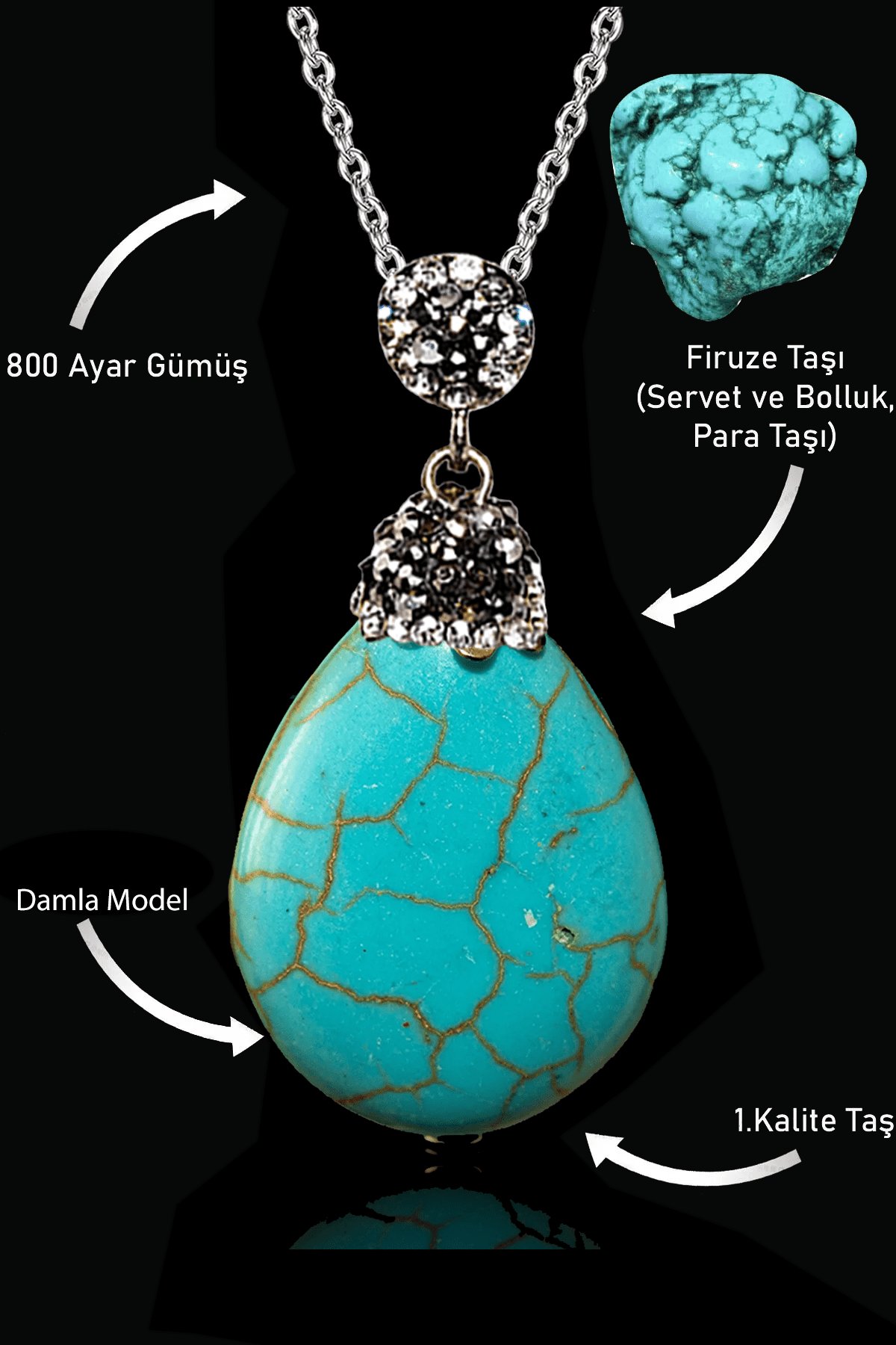 Sertifikalı XL Zirkon Taşlı Damla Model Firuze Taşı Kolye (Turkuaz Taşı)