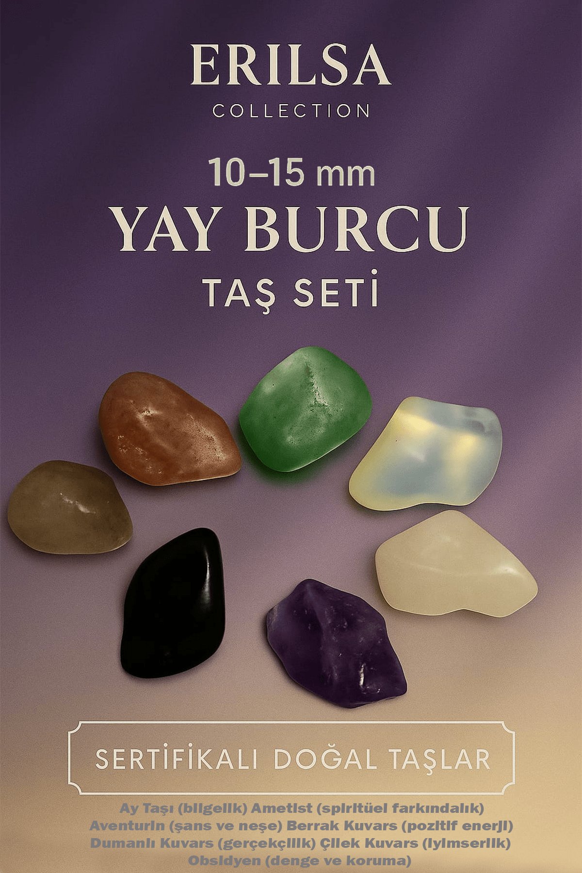 Yay burcu için hazırlanan bu özel doğal taş seti, 10-15 mm ebatlarında sertifikalı taşlardan oluşur.