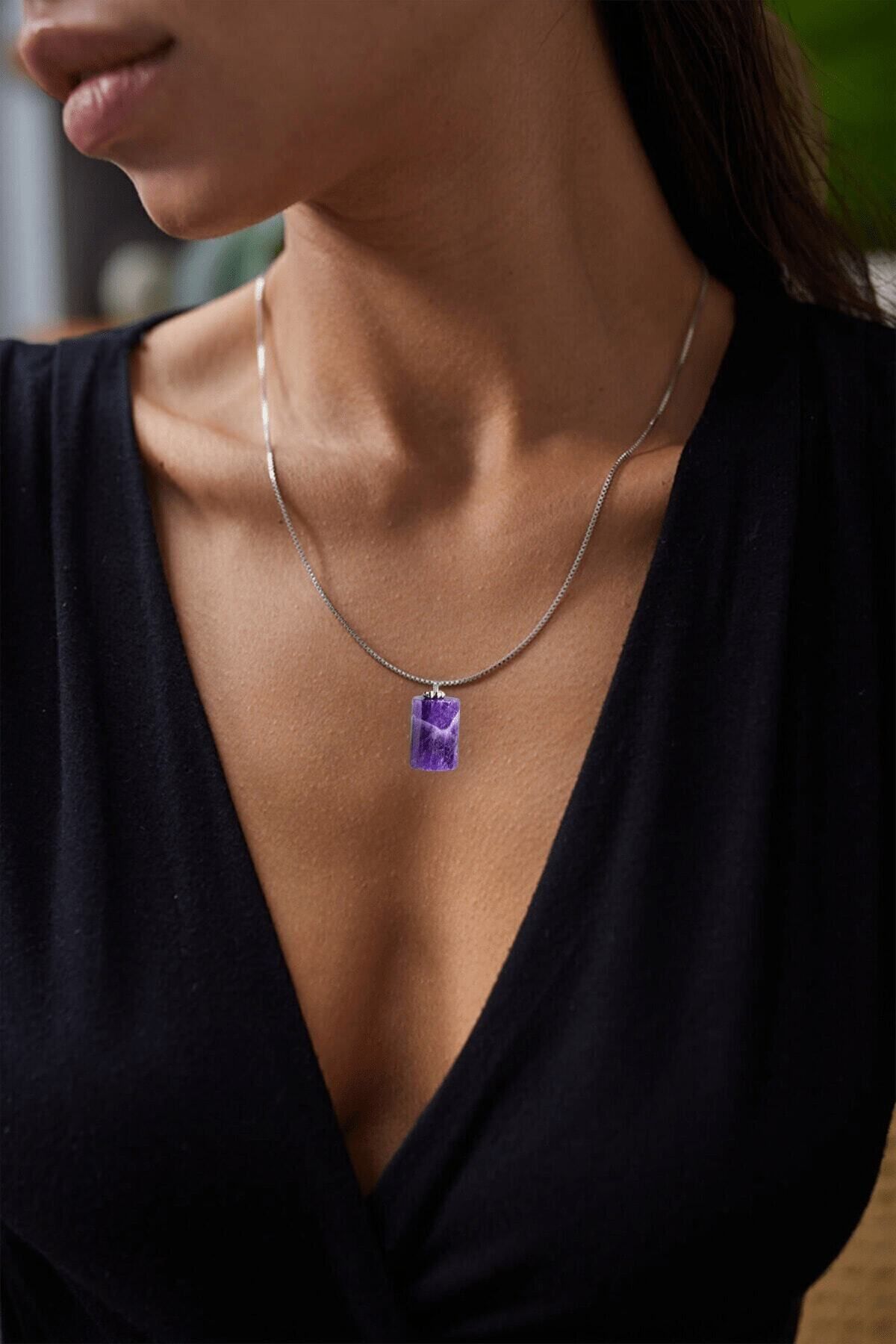 Bu doğal taş kolye tasarımımızda; Yüksek kalite doğal ametist taşı kullanılmıştır. Zincir ölçüsü 50 cm'dir. Her bayan için uyumludur. Yetişkin ve çocuk için kullanılabilir. %100 Orijinal ve gerçek taştır. Sinirinizi stresinizi alacak, mineral açısından oldukça zengin olduğu için bulunduğu için teniniz ile temas eder etmez aradaki farkı kısa bir süre içinde hissedeceksiniz.