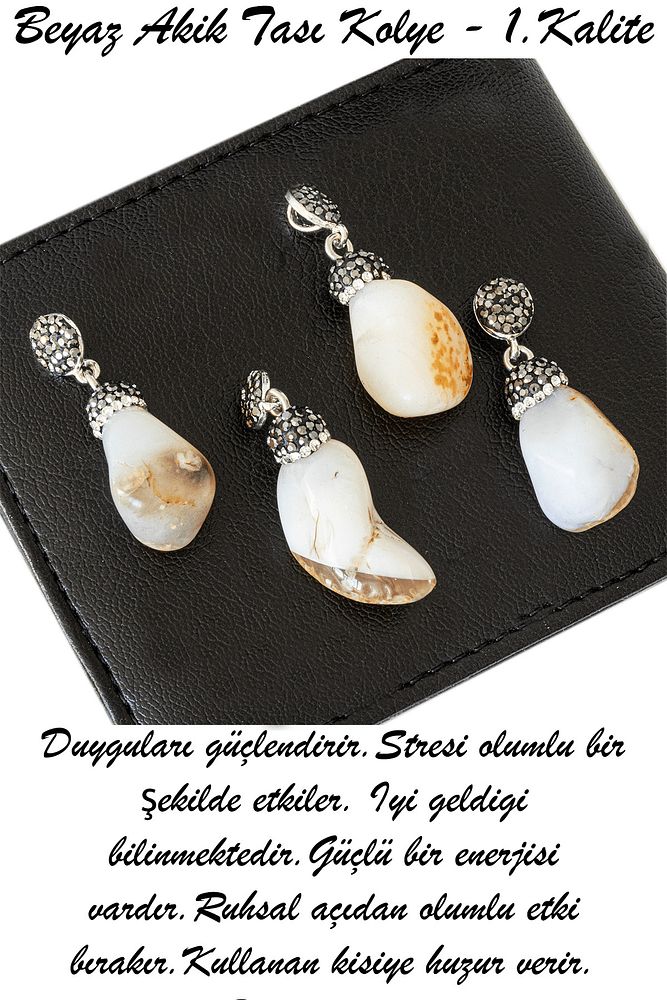 Bu doğal taş kolye tasarımımızda; Beyaz akik taşı kolye kullanılmıştır. Zincir ölçüsü 45 cm'dir. Her için uyumludur. Yetişkin ve çocuk için kullanılabilir. %100 Orijinal ve gerçek taştır. inizi stresinizi alacak, mineral açısından oldukça zengin olduğu için bulunduğu için teniniz ile temas eder etmez aradaki farkı kısa bir süre içinde hissedeceksiniz.