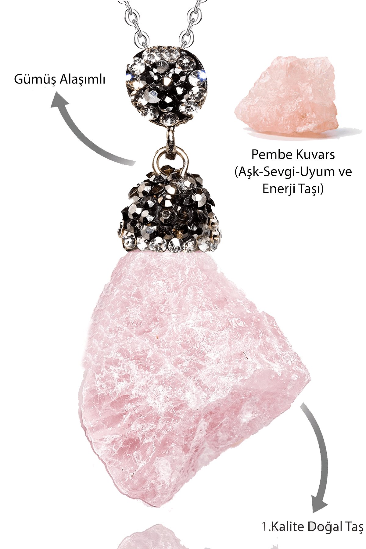 Sertifikalı Zirkon Taşlı Ham İşlenmemiş Pembe Kuvars Taşı Kolye