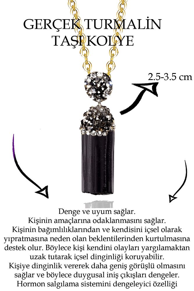 Bu doğal taş kolye tasarımımızda; Siyah turmalin taşı kullanılmıştır. Zincir ölçüsü 45 cm'dir. Her için uyumludur. Yetişkin ve çocuk için kullanılabilir. %100 Orijinal ve gerçek taştır. Sinirinizi stresinizi alacak, mineral açısından oldukça zengin olduğu için bulunduğu için teniniz ile temas eder etmez aradaki farkı kısa bir süre içinde hissedeceksiniz.