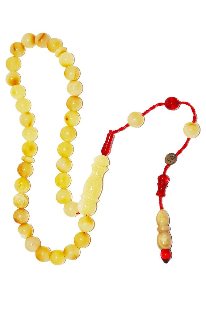 Bu tasarımda; Günlük çekim küre kesim mat ukrayna %100 doğal damla kehribar taşı kullanılmıştır. Püskül yapımında; Kırmızı geçişli kısımlar blok zardır. Sıralı sistem kullanılmıştır. ; Üretildiği Taş ; Kehribar Taşı ; Renk ; Doğal Renk ; Ağırlık ; 8.8 gr ; Tane Şekli ; 6.7x6.7 mm ; Tane Ölçüsü ; Küre Kesim ; Toplam Uzunluk ; 20-30 cm ; Püskül Maddesi ; Sistemli ;