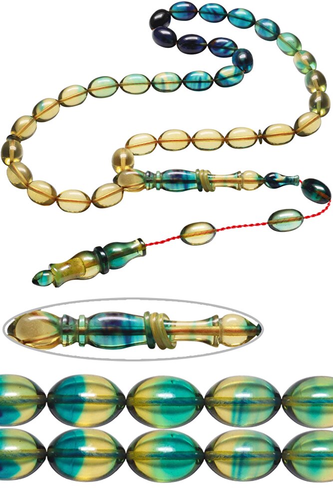 Ürün ya da Doğal Taş Açıklaması (Ağrı Kesici, Sinir Stres ve Bereket Taşı) Ateş kehribar tesbih modelleri, ''Tesbih Atölyesi'' Atölyelerinde ustalarımız tarafından kuru torna işciliği ile elde özen ile tane tane işlenmektedir. Ürünlerimiz el işciliği olduğu için sınırlı sayıda üretilmektedir. Tasarımlarımızda kullandığımız reçineler Dünya'nın en kaliteli reçineleridir. Kısa bir süre içerisinde renk alır ve koku verir. Ürünleriniz orijinallik ve garanti belgesi ile gönderilir. Tasarımlarımıza üç kat cila atılmıştır. Muhteşem bir çekime sahip koleksiyonluk ve günlük çekim için ideal ürünlerdir. Bu tasarımda; Mavi renk hüzmesi özel ultra kaliteli renk alan ve koku veren kaliteli ateş kehribar reçine kullanılmıştır. Her kehribar tanesi birbirinin aynısı olmadığı için küçükte olsa farklılıklar gösterebilir. Üretildiği Malzeme; Ateş Kehribar; Ana Renk; Mavi Renk Hüzmesi; Ağırlık; 20-30 gr; Tane Şekli; 7.5x11.5 mm; Tane Ölçüsü; Beyzi Kesim; Toplam Uzunluk; 20-30 cm; İmame ve Püskül Maddesi; Sistemli;