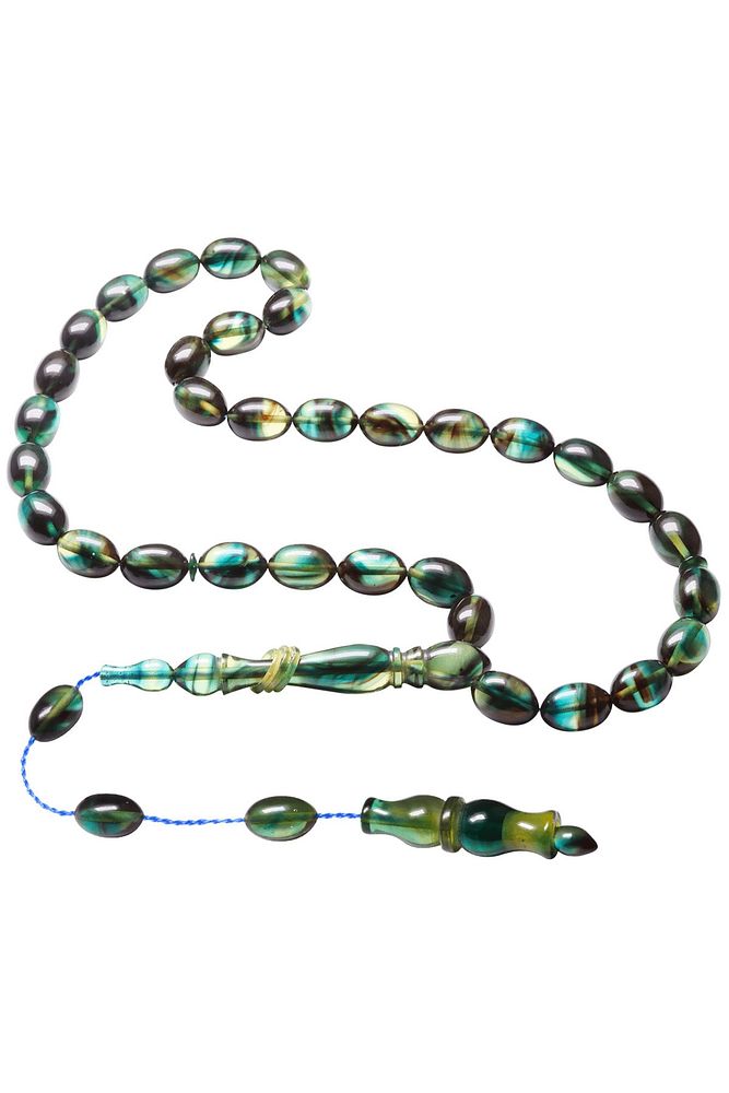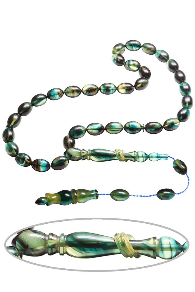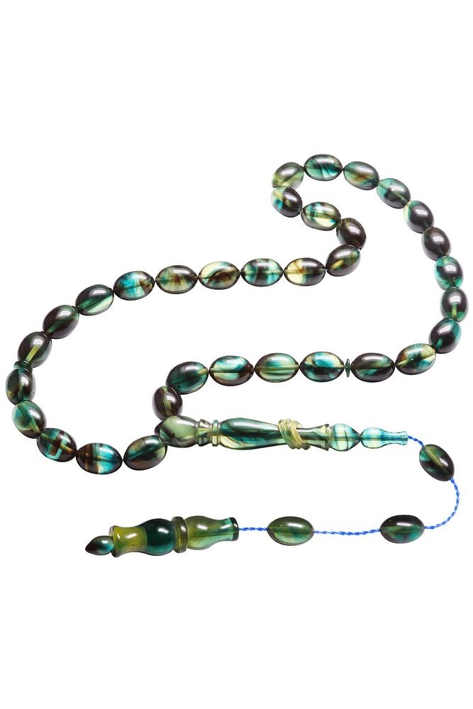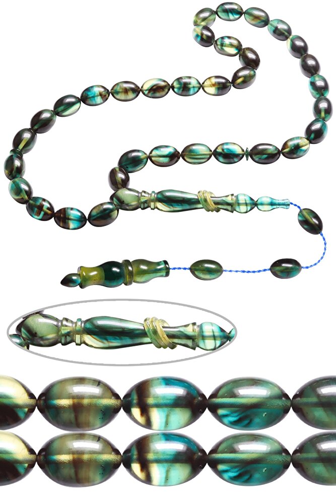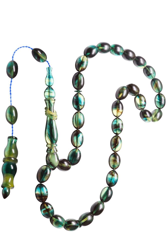 Sistemli Beyzi Kesim Mavi Siyah Renkli Halkalı Ateş Kehribar Tesbih