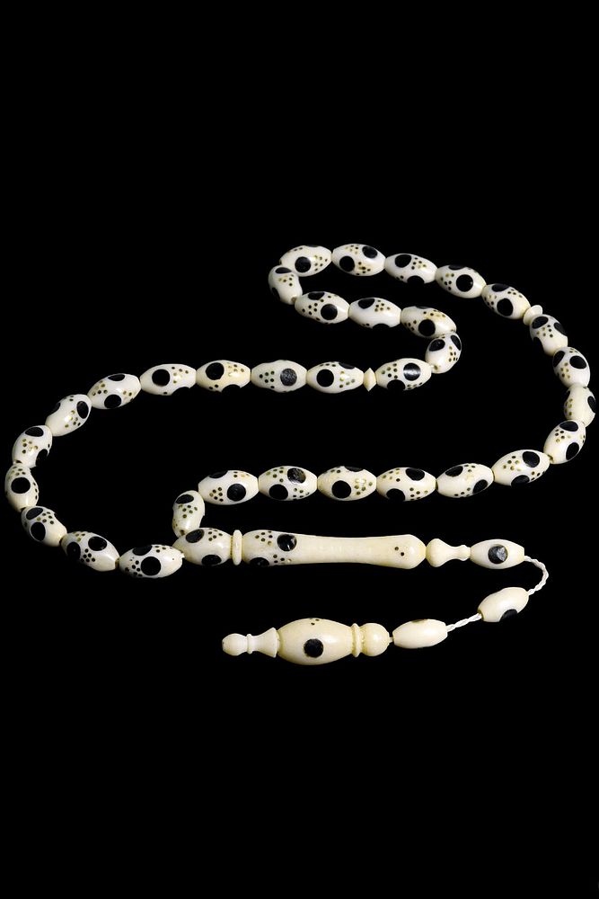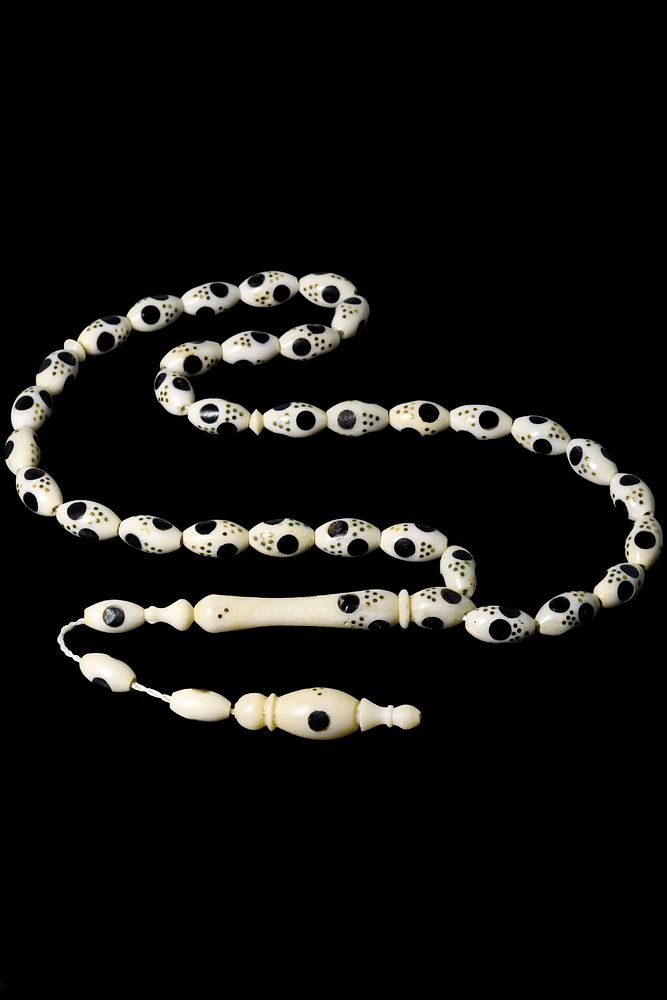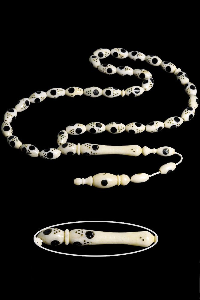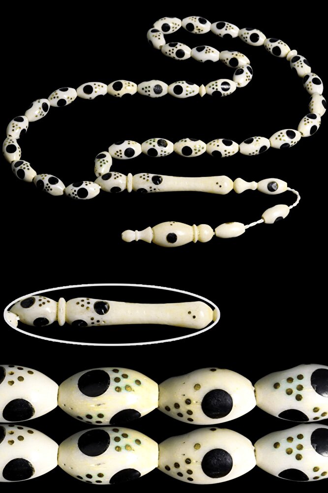 Sistemli Beyzi Kesim Siyah Mineli Pirinç Işlemeli Deve Kemiği Tesbih