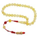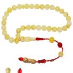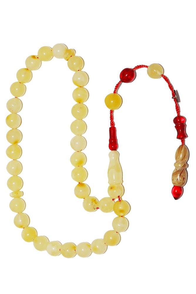 (Doğal Sakinleştirici, Astım, Guatr ve Ağrı Kesici Taşı) ; ; Doğal damla kehribar tesbih modelleri, ”Tesbih Atölyesi” Atölyelerinde ustalarımız tarafından kuru torna işciliği ile elde özen ile tane tane işlenmektedir. Ürünlerimiz el işlemesi olduğu için sınırlı sayıda üretilmektedir. Üzerine üç kat el cilası atılmıştır. Kehribar çam ağacının fosilleşmiş reçinesidir. Baltık ülkelerinden en kaliteli kehribar kütlelerini ithal etmekteyiz. Damla kehribar tesbih Buram buram çam kokulu ürünlerimiz %100 doğal, garantili ve sertifikalıdır. Ürünlerimiz fabrikasyon olmadığı için kehribar tanelerinin hiç biri birbirinin aynısı olmadığı için küçükte olsa farklılıklar olabilir. ; ; Bu tasarımda; Sistemli küre kesim her tanesi kumpas işlemeli özel mat kraliçe bem beyaz özel kaya ukrayna damla kehribar taşı kullanılmıştır. ; ; Üretildiği Taş ; Kehribar Taşı ; Renk ; Doğal Renk ; Ağırlık ; 7.3 gr ; Tane Şekli ; 6.6×6.6 mm ; Tane Ölçüsü ; Küre Kesim ; Toplam Uzunluk ; 20-30 cm ; Püskül Maddesi ; Sistemli ;