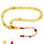 (Doğal Sakinleştirici, Astım, Guatr ve Ağrı Kesici Taşı); ; Doğal damla kehribar tesbih modelleri, ”Tesbih Atölyesi” Atölyelerinde ustalarımız tarafından kuru torna işciliği ile elde özen ile tane tane işlenmektedir. Ürünlerimiz el işlemesi olduğu için sınırlı sayıda üretilmektedir. Üzerine üç kat el cilası atılmıştır. Kehribar çam ağacının fosilleşmiş reçinesidir. Baltık ülkelerinden en kaliteli kehribar kütlelerini ithal etmekteyiz. Damla kehribar tesbih Buram buram çam kokulu ürünlerimiz %100 doğal, garantili ve sertifikalıdır. Ürünlerimiz fabrikasyon olmadığı için kehribar tanelerinin hiç biri birbirinin aynısı olmadığı için küçükte olsa farklılıklar olabilir.; ; Bu tasarımda; Sistemli küre kesim her tanesi kumpas işlemeli özel mat kraliçe bem beyaz özel kaya ukrayna damla kehribar taşı kullanılmıştır. ; ; Üretildiği Taş; Kehribar Taşı; Renk; Doğal Renk; Ağırlık; 7.8 gr; Tane Şekli; 6.8×6.8 mm; Tane Ölçüsü; Küre Kesim; Toplam Uzunluk; 20-30 cm; Püskül Maddesi; Sistemli;