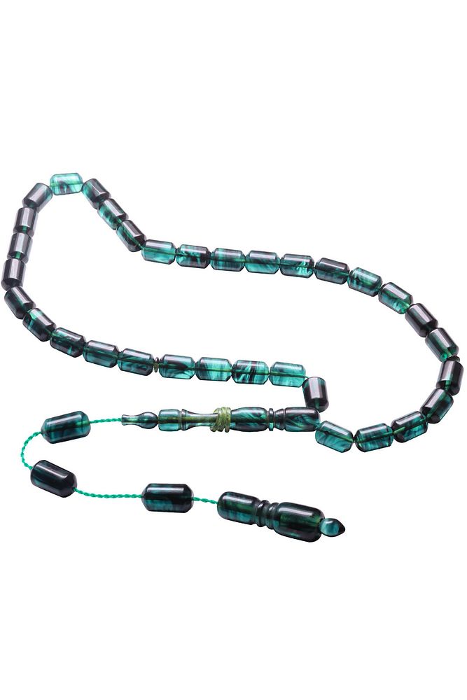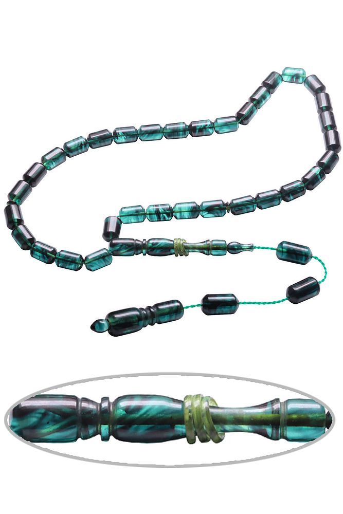 Ürün ya da Doğal Taş Açıklaması; ; (Ağrı Kesici, Sinir Stres ve Bereket Taşı); ; Ateş kehribar tesbih modelleri, ''Tesbih Atölyesi'' Atölyelerinde ustalarımız tarafından kuru torna işciliği ile elde özen ile tane tane işlenmektedir. Ürünlerimiz el işciliği olduğu için sınırlı sayıda üretilmektedir. Tasarımlarımızda kullandığımız reçineler Dünya'nın en kaliteli reçineleridir. Kısa bir süre içerisinde renk alır ve koku verir. Ürünleriniz orijinallik ve garanti belgesi ile gönderilir. Tasarımlarımıza üç kat cila atılmıştır. Muhteşem bir çekime sahip koleksiyonluk ve günlük çekim için ideal ürünlerdir.; ; Bu tasarımda; Koyu mavi ve siyah renkli yoğun hareli renk alan ve koku veren kaliteli ateş kehribar reçine kullanılmıştır. Her kehribar tanesi birbirinin aynısı olmadığı için küçükte olsa farklılıklar gösterebilir.; ; Üretildiği Malzeme; Ateş Kehribar; Ana Renk; Koyu Mavi ve Siyah Renk; Ağırlık; 20-30 gr; Tane Şekli; 8x12 mm; Tane Ölçüsü; Kapsül Kesim; Toplam Uzunluk; 20-30 cm; İmame ve Püskül Maddesi; Sistemli;