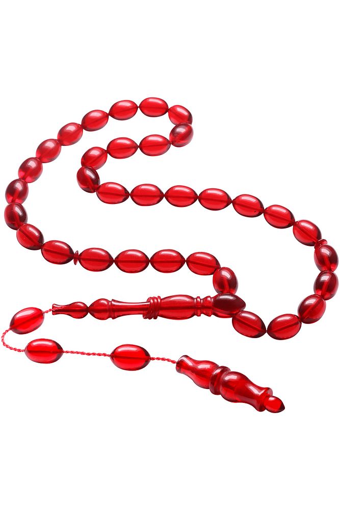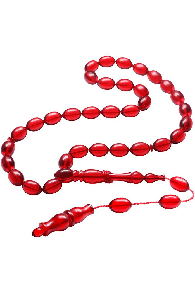 Üretildiği Malzeme : Ateş Kehribar Ana Renk : Kan Kırmızı Renk Ağırlık : 20-30 gr Tane Şekli : 7.5x11.5 mm Tane Ölçüsü : Beyzi Kesim Toplam Uzunluk : 20-30 cm İmame ve Püskül Maddesi : Sistemli