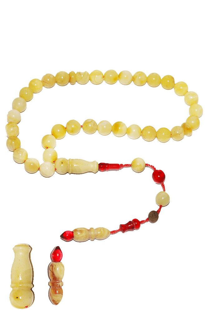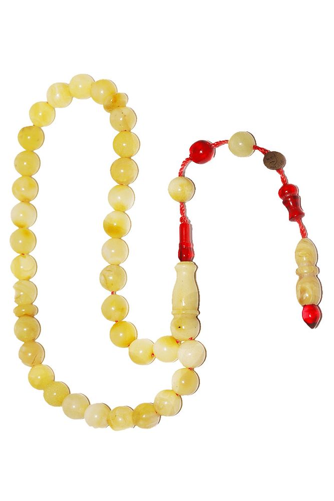 Ürün ya da Doğal Taş Açıklaması (Doğal Sakinleştirici, Astım, Guatr ve Ağrı Kesici Taşı) Doğal damla kehribar tesbih modelleri, ''Tesbih Atölyesi'' Atölyelerinde ustalarımız tarafından kuru torna işciliği ile elde özen ile tane tane işlenmektedir. Ürünlerimiz el işciliği olduğu için sınırlı sayıda üretilmektedir. Üzerine üç kat el cilası atılmıştır. Kehribar çam ağacının fosilleşmiş reçinesidir. Baltık ülkelerinden en kaliteli kehribar kütlelerini ithal etmekteyiz. Damla kehribar tesbih Buram buram çam kokulu ürünlerimiz %100 doğal, garantili ve sertifikalıdır. Ürünlerimiz fabrikasyon olmadığı için kehribar tanelerinin hiç biri birbirinin aynısı olmadığı için küçükte olsa farklılıklar olabilir. Bu tasarımda; Günlük çekim küre kesim mat ukrayna %100 doğal damla kehribar taşı kullanılmıştır. Püskül yapımında; Kırmızı geçişli kısımlar blok zardır. Sıralı sistem kullanılmıştır. Üretildiği Taş; Kehribar Taşı; Renk; Doğal Renk; Ağırlık; 8.3 gr; Tane Şekli; 6.6x6.6 mm; Tane Ölçüsü; Küre Kesim; Toplam Uzunluk; 20-30 cm; Püskül Maddesi; Sistemli;