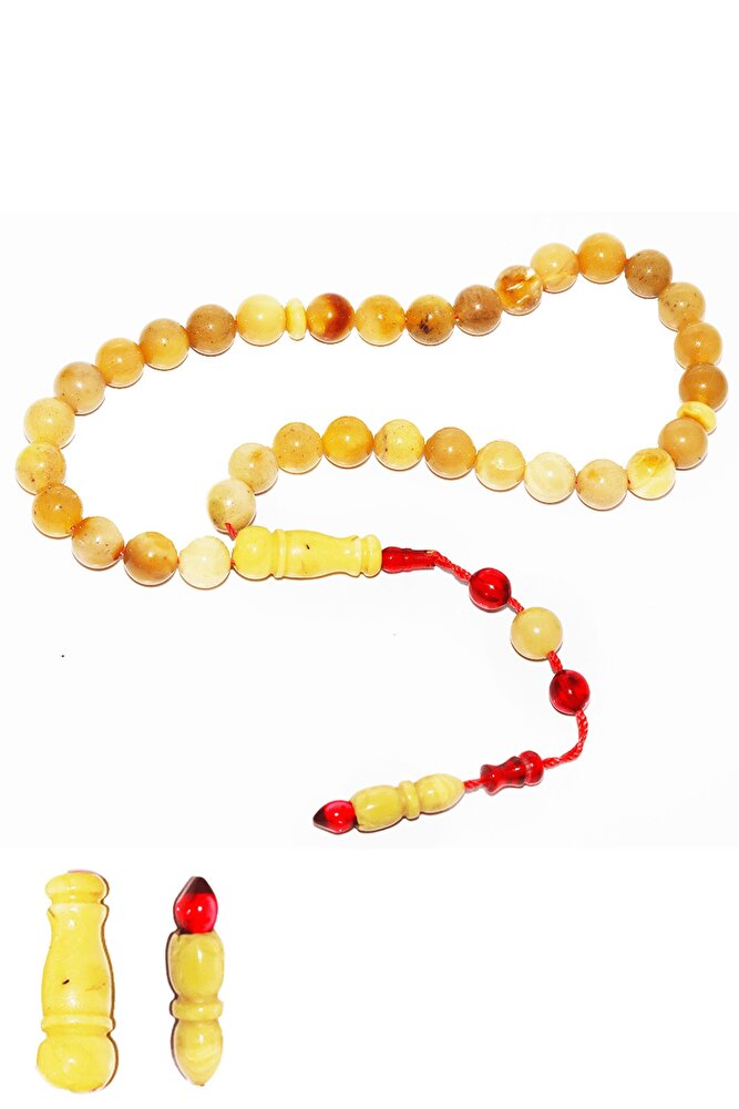 Ürün ya da Doğal Taş Açıklaması (Doğal Sakinleştirici, Astım, Guatr ve Ağrı Kesici Taşı) Doğal damla kehribar tesbih modelleri, ''Tesbih Atölyesi'' Atölyelerinde ustalarımız tarafından kuru torna işciliği ile elde özen ile tane tane işlenmektedir. Ürünlerimiz el işciliği olduğu için sınırlı sayıda üretilmektedir. Üzerine üç kat el cilası atılmıştır. Kehribar çam ağacının fosilleşmiş reçinesidir. Baltık ülkelerinden en kaliteli kehribar kütlelerini ithal etmekteyiz. Damla kehribar tesbih Buram buram çam kokulu ürünlerimiz %100 doğal, garantili ve sertifikalıdır. Ürünlerimiz fabrikasyon olmadığı için kehribar tanelerinin hiç biri birbirinin aynısı olmadığı için küçükte olsa farklılıklar olabilir. Bu tasarımda; Günlük çekim küre kesim mat ukrayna %100 doğal damla kehribar taşı kullanılmıştır. Püskül yapımında; Kırmızı geçişli kısımlar blok zardır. Sıralı sistem kullanılmıştır. Üretildiği Taş; Kehribar Taşı; Renk; Doğal Renk; Ağırlık; 11.6 gr; Tane Şekli; 7.7x7.7 mm; Tane Ölçüsü; Küre Kesim; Toplam Uzunluk; 20-30 cm; Püskül Maddesi; Sistemli;