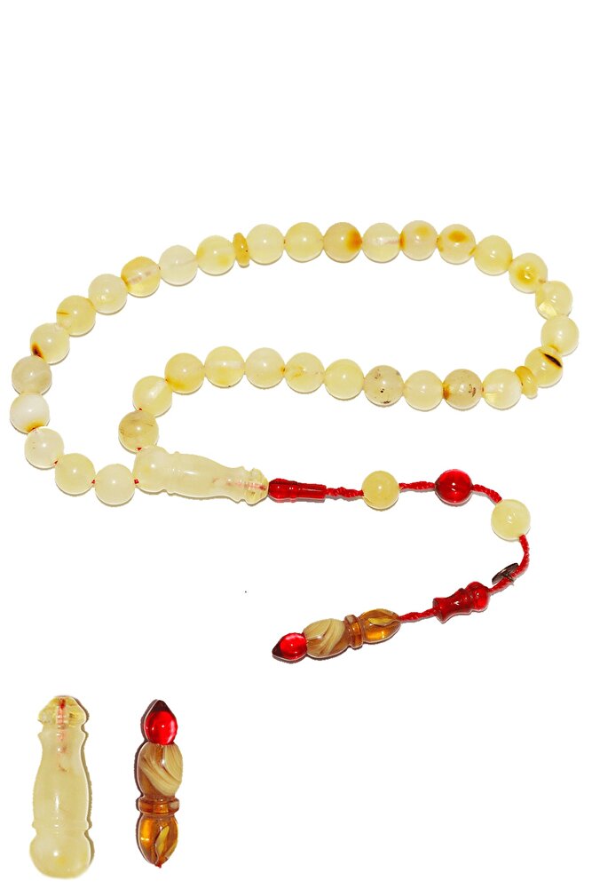 Ürün ya da Doğal Taş Açıklaması (Doğal Sakinleştirici, Astım, Guatr ve Ağrı Kesici Taşı) Doğal damla kehribar tesbih modelleri, \'\'Tesbih Atölyesi\'\' Atölyelerinde ustalarımız tarafından kuru torna işciliği ile elde özen ile tane tane işlenmektedir. Ürünlerimiz el işciliği olduğu için sınırlı sayıda üretilmektedir. Üzerine üç kat el cilası atılmıştır. Kehribar çam ağacının fosilleşmiş reçinesidir. Baltık ülkelerinden en kaliteli kehribar kütlelerini ithal etmekteyiz. Damla kehribar tesbih Buram buram çam kokulu ürünlerimiz %100 doğal, garantili ve sertifikalıdır. Ürünlerimiz fabrikasyon olmadığı için kehribar tanelerinin hiç biri birbirinin aynısı olmadığı için küçükte olsa farklılıklar olabilir. Bu tasarımda; Günlük çekim küre kesim mat ukrayna %100 doğal damla kehribar taşı kullanılmıştır. Püskül yapımında; Kırmızı geçişli kısımlar blok zardır. Sıralı sistem kullanılmıştır. Üretildiği Taş; Kehribar Taşı; Renk; Doğal Renk; Ağırlık; 8.5 gr; Tane Şekli; 6.8x6.8 mm; Tane Ölçüsü; Küre Kesim; Toplam Uzunluk; 20-30 cm; Püskül Maddesi; Sistemli;
