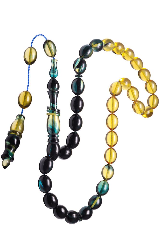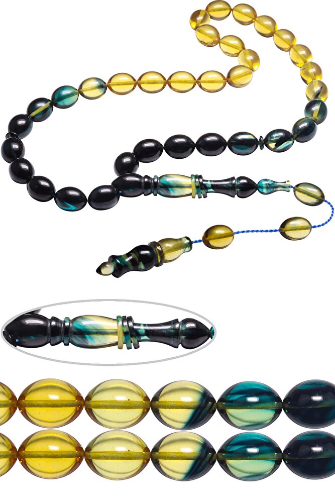Ürün ya da doğal taş açıklaması (ağrı kesici, sinir stres ve bereket taşı) ateş kehribar tesbih modelleri, ''tesbih atölyesi'' atölyelerinde ustalarımız tarafından kuru torna işciliği ile elde özen ile tane tane işlenmektedir. Ürünlerimiz el işciliği olduğu için sınırlı sayıda üretilmektedir. Tasarımlarımızda kullandığımız reçineler dünya'nın en kaliteli reçineleridir. Kısa bir süre içerisinde renk alır ve koku verir. Ürünleriniz orijinallik ve garanti belgesi ile gönderilir. Tasarımlarımıza üç kat cila atılmıştır. Muhteşem bir çekime sahip koleksiyonluk ve günlük çekim için ideal ürünlerdir. Bu tasarımda; koyu mavi renk hüzmesi 1.Sınıf orijinal renk alan ve koku veren kaliteli ateş kehribar reçine kullanılmıştır. Her kehribar tanesi birbirinin aynısı olmadığı için küçükte olsa farklılıklar gösterebilir. Üretildiği malzeme ateş kehribar ana renk koyu mavi renk ağırlık 20-30 gr tane şekli 8.5x11.5 mm tane ölçüsü beyzi kesim toplam uzunluk 20-30 cm imame ve püskül maddesi sistemli