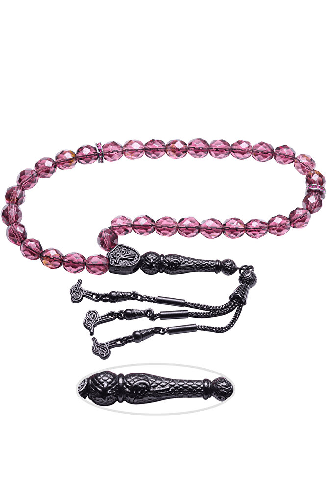 Bu tasarımın yapımında; Mor şeffaf renkli fasetli doğal elmas kesim ametist taşı kullanılmıştır. İmame ve püskül tasarımında; Nikel püsküllü imame ve püskül seti kullanılmıştır. Çift kaplama atıldığı için renk atmaz ve kararmaz bir yapıya sahiptir.