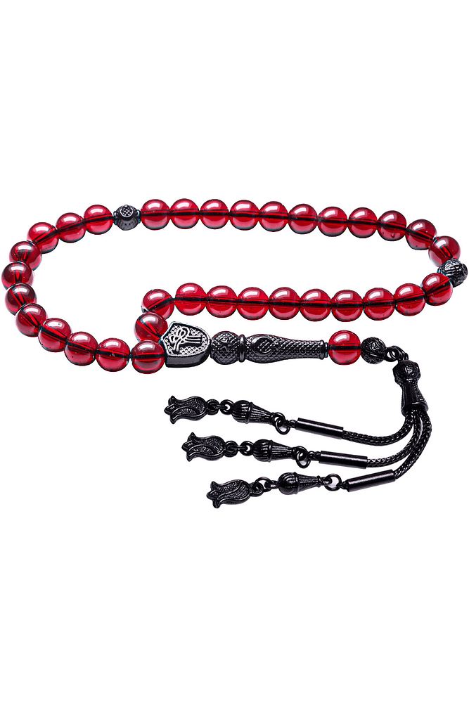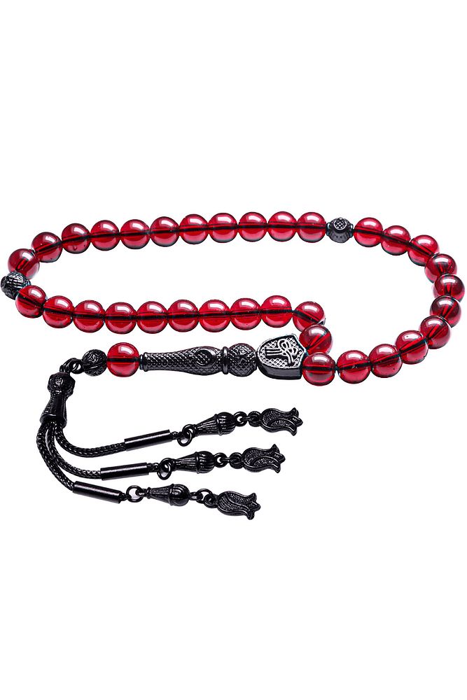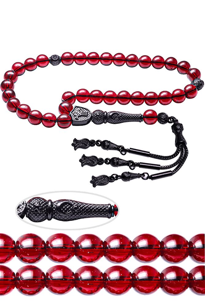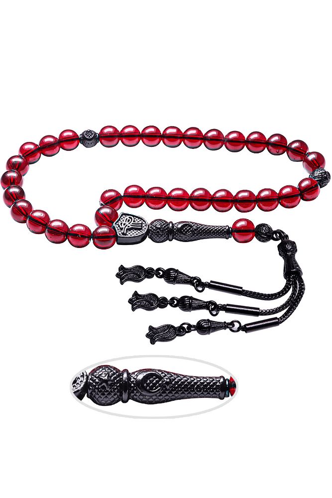 Bu tasarımın yapımında; Kan kırmızı renkli şeffaf doğal yemen akik taşı kullanılmıştır. İmame ve püskül tasarımında; Siyah nikel imame ve püskül seti kullanılmıştır. Çift kaplama atıldığı için renk atmaz ve kararmaz bir yapıya sahiptir.