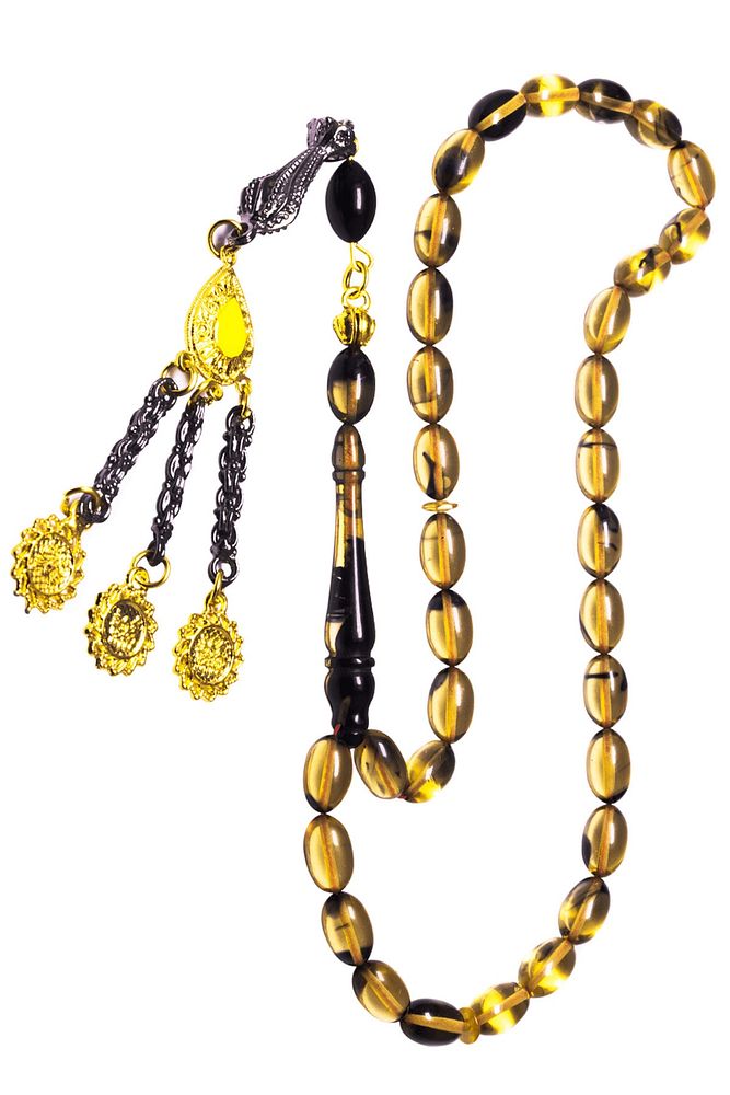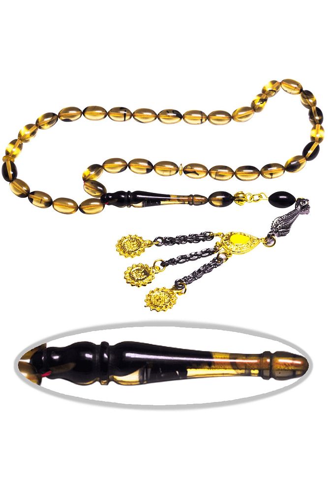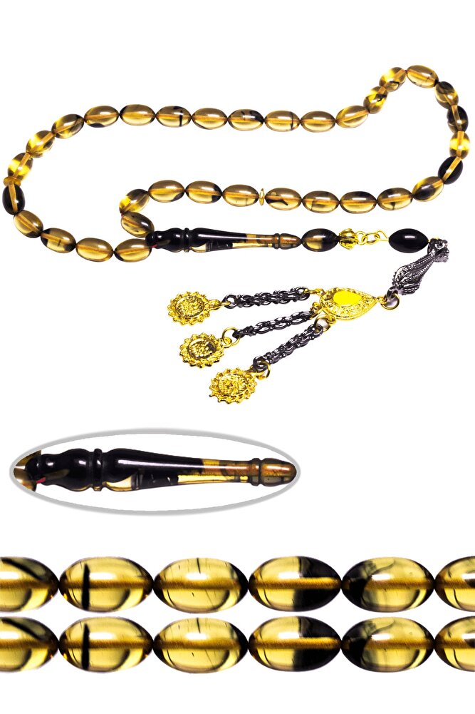 Ürün ya da Doğal Taş Açıklaması (Ağrı Kesici, Sinir Stres ve Bereket Taşı) Ateş kehribar tesbih modelleri, ''Tesbih Atölyesi'' Atölyelerinde ustalarımız tarafından kuru torna işciliği ile elde özen ile tane tane işlenmektedir. Ürünlerimiz el işciliği olduğu için sınırlı sayıda üretilmektedir. Tasarımlarımızda kullandığımız reçineler Dünya'nın en kaliteli reçineleridir. Kısa bir süre içerisinde renk alır ve koku verir. Ürünleriniz orijinallik ve garanti belgesi ile gönderilir. Tasarımlarımıza üç kat cila atılmıştır. Muhteşem bir çekime sahip koleksiyonluk ve günlük çekim için ideal ürünlerdir. Bu tasarımda; Siyah şeffaf renkli özel yoğun hareli renk alan ve koku veren kaliteli ateş kehribar reçine kullanılmıştır. Her kehribar tanesi birbirinin aynısı olmadığı için küçükte olsa farklılıklar gösterebilir. Üretildiği Malzeme; Ateş Kehribar; Ana Renk; Siyah ve Şeffaf Renk; Ağırlık; 20-30 gr; Tane Şekli; 7x11 mm; Tane Ölçüsü; Beyzi Kesim; Toplam Uzunluk; 20-30 cm; İmame ve Püskül Maddesi; Düşük Ayar Gümüş;