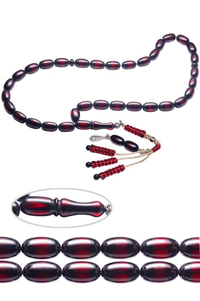 (Ağrı Kesici, Sinir Stres ve Bereket Taşı); ; Ateş kehribar tesbih modelleri, ''Tesbih Atölyesi'' Atölyelerinde ustalarımız tarafından kuru torna işciliği ile elde özen ile tane tane işlenmektedir. Ürünlerimiz el işciliği olduğu için sınırlı sayıda üretilmektedir. Tasarımlarımızda kullandığımız reçineler Dünya'nın en kaliteli reçineleridir. Kısa bir süre içerisinde renk alır ve koku verir. Ürünleriniz orijinallik ve garanti belgesi ile gönderilir. Tasarımlarımıza üç kat cila atılmıştır. Muhteşem bir çekime sahip koleksiyonluk ve günlük çekim için ideal ürünlerdir.; ; Bu tasarımda; Yeşil ve siyah renkli özel yoğun hareli kaliteli ve orijinal renk alan ve koku veren kaliteli ateş kehribar reçine kullanılmıştır. Her kehribar tanesi birbirinin aynısı olmadığı için küçükte olsa farklılıklar gösterebilir.; ; Üretildiği Malzeme; Ateş Kehribar; Ana Renk; Bordo ve Kırmızı Renk; Ağırlık; 20-30 gr; Tane Şekli; 7.5x13.5 mm; Tane Ölçüsü; Kapsül Kesim; Toplam Uzunluk; 20-30 cm; İmame ve Püskül Maddesi; Makrome;